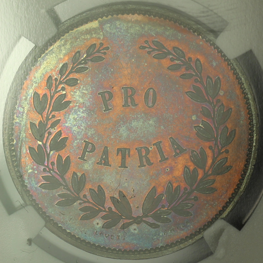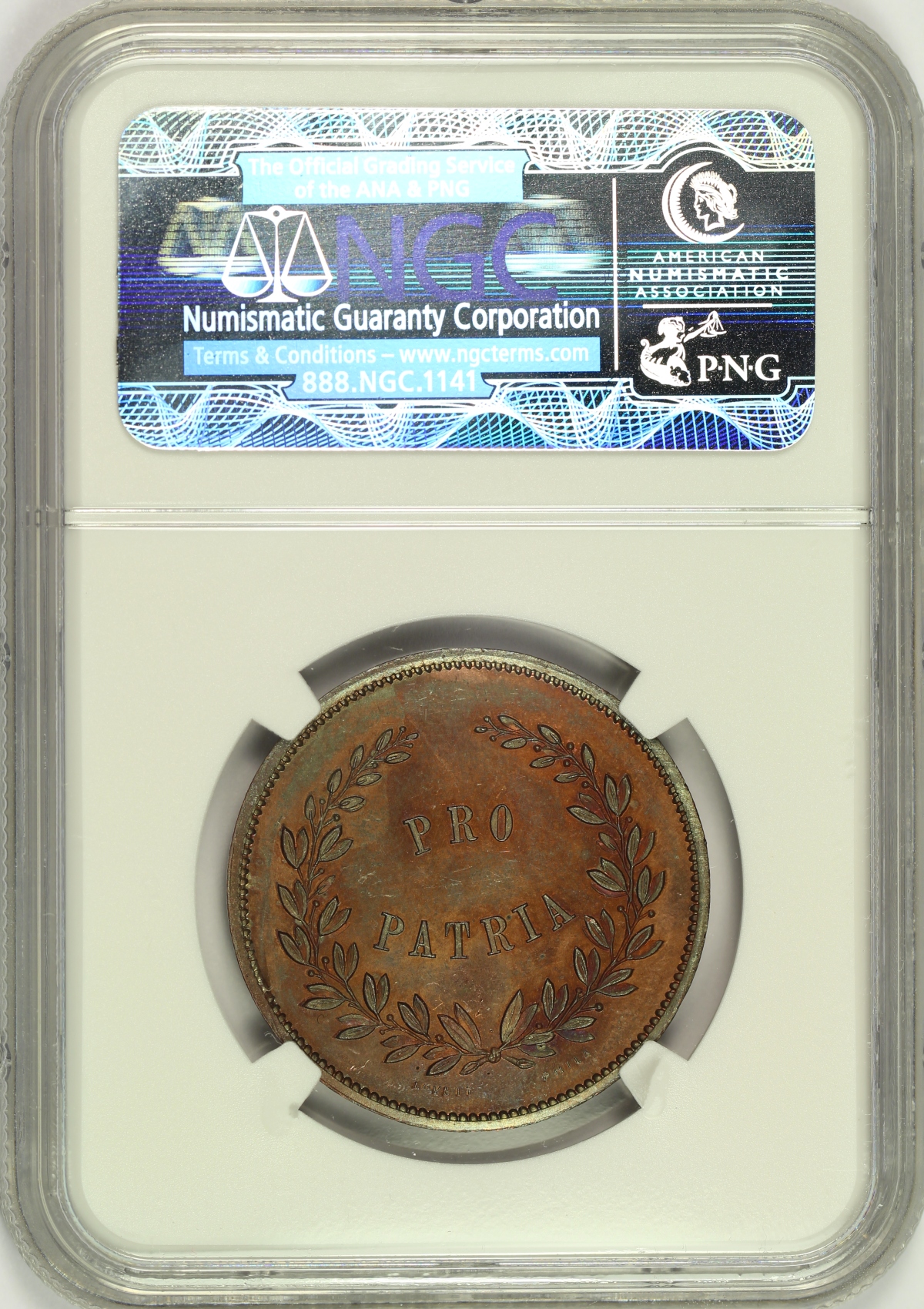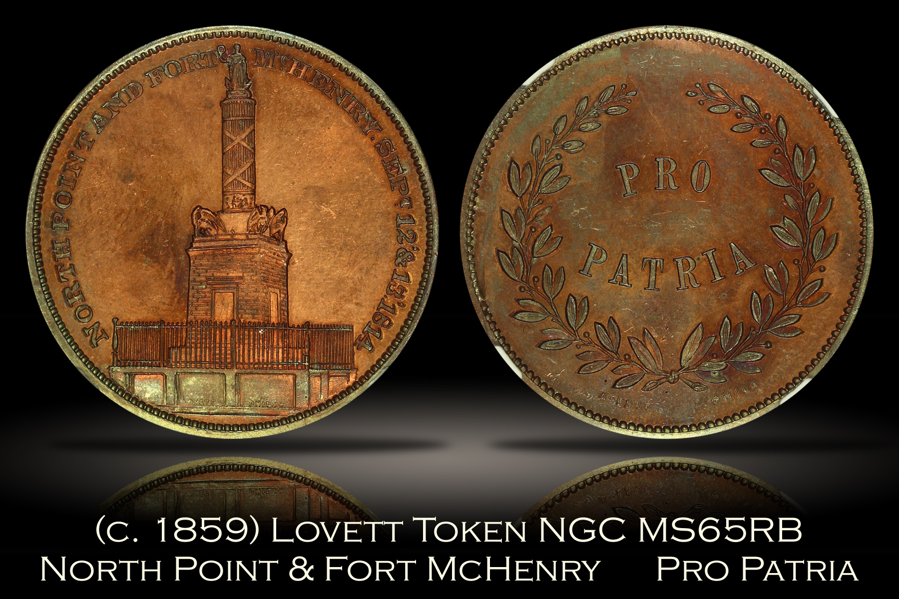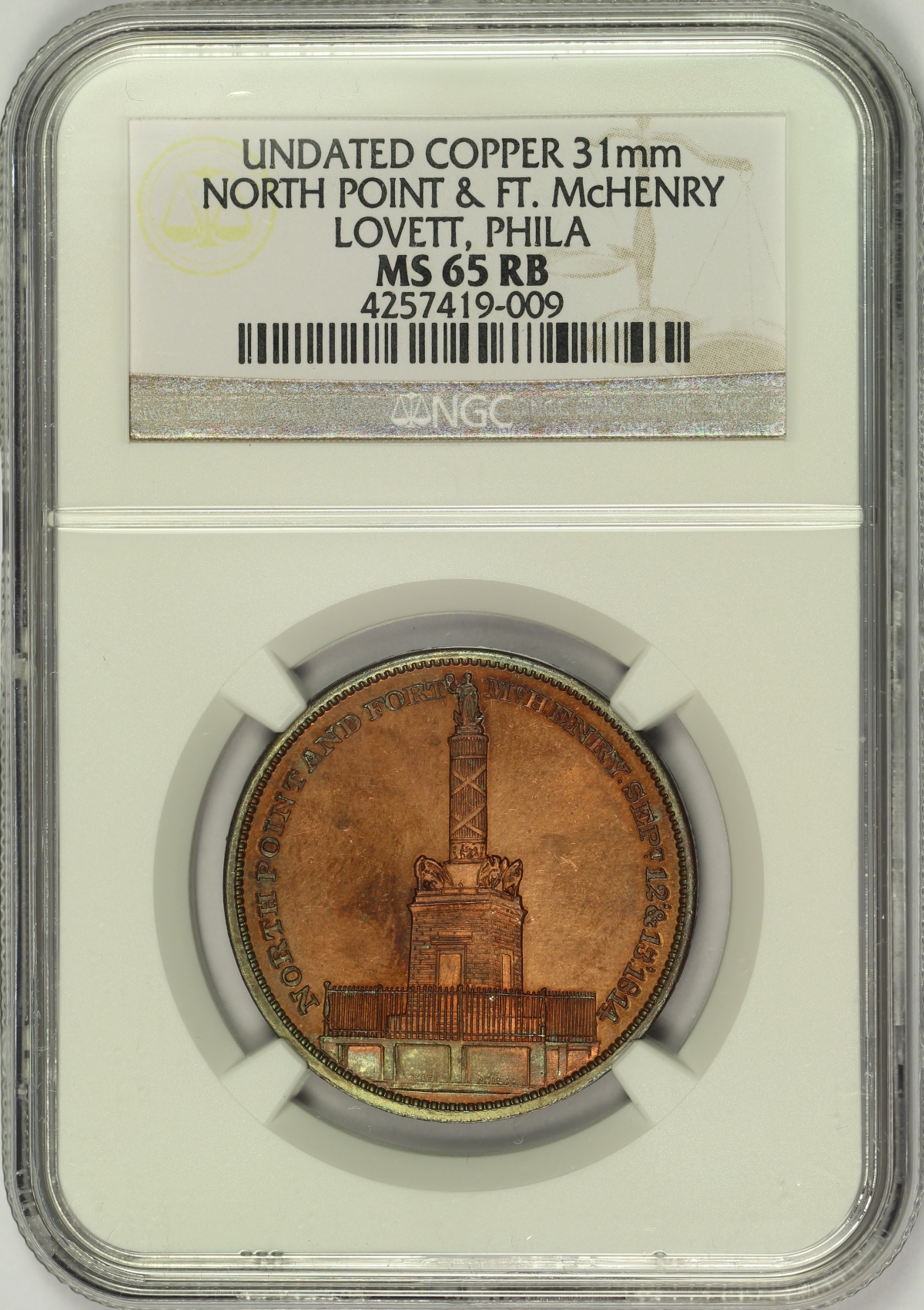 | Here is an undated copper token by Robert Lovett which commemorates North Point and Ft. McHenry from the Battle of Baltimore in September 1814, which was the inspiration of Francis Scott Key’s Star Spangled Banner. The North Point & Fort McHenry Lovett Token has been graded MS65RB by NGC and is encapsulated in one of their newer-style edge-view holders. The designs on each side of this piece are also found on other tokens. The obverse design of Ft. McHenry monument is also used as the reverse of the Baker 324 Washington token. Similarly, the reverse Pro Patria design of this piece was also used as the reverse of the Baker 268 Washington token. Given that information, it is believed that the piece here was likely made in or about 1859. The token is semi-prooflike and exhibits some attractive and colorful toning when tilted into direct lighting. Unfortunately, the beautiful color is not fully captured by the photos provided and is much more colorful and flashy in hand. An eye appealing high grade token by Robert Lovett. |