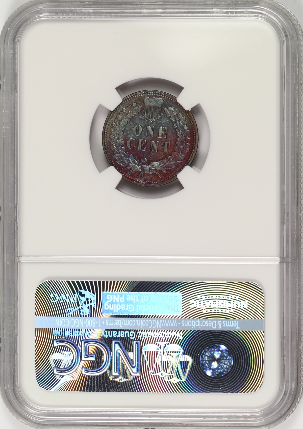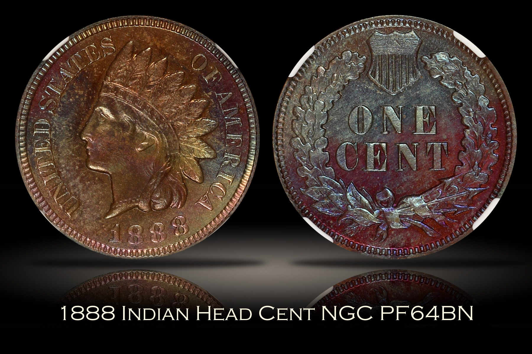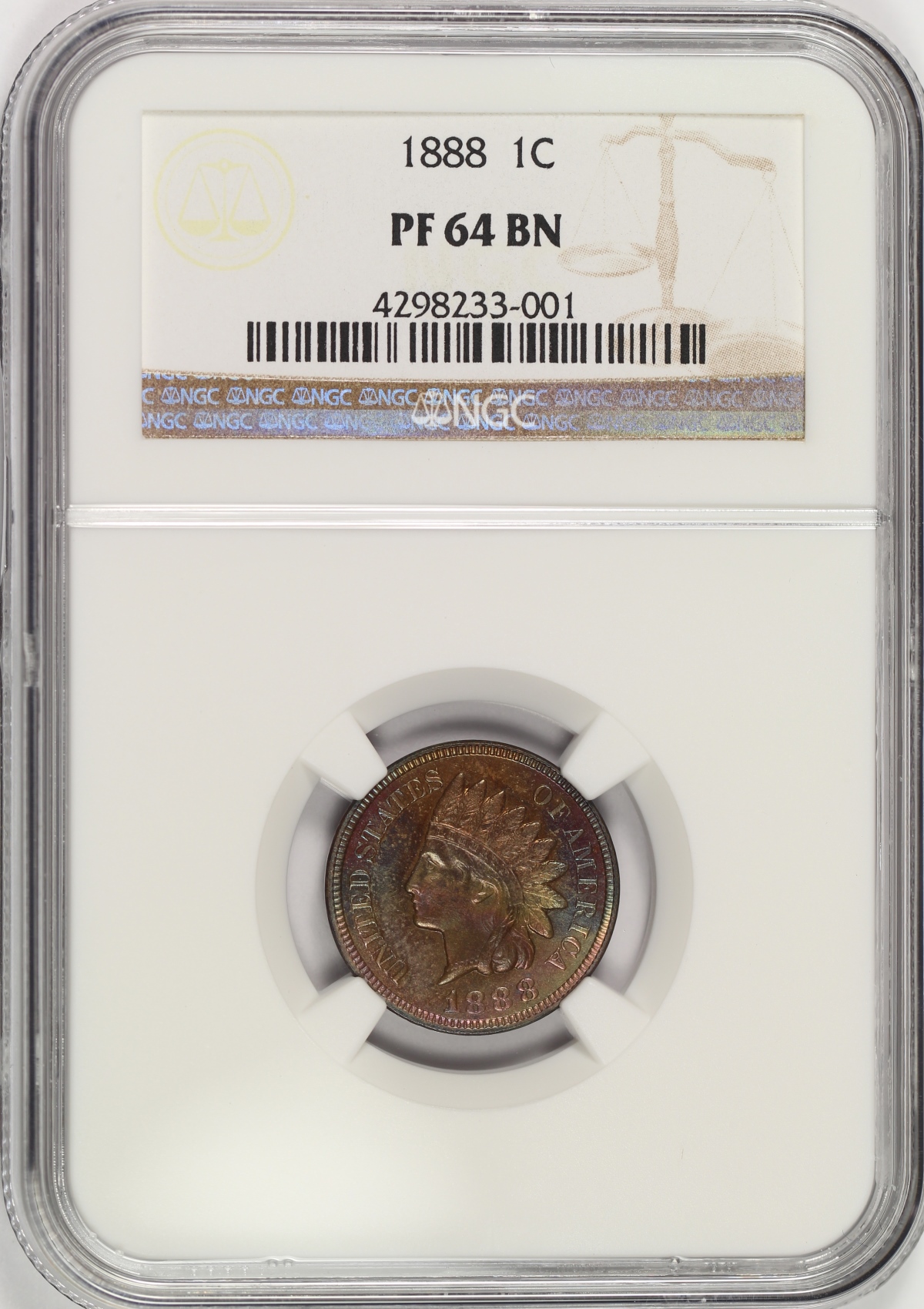 This is an 1888 Proof Indian Head Cent graded PF64BN by NGC and is encapsulated in one of their newer-style edge-view holders. Only 4,582 proof Indian Head Cents were minted in 1888 which is an ultra-low mintage compared to moderns. The coin has excellent overall eye appeal with vibrant colorful attractive toning, particularly on the reverse, and also exhibits nice reflective mirrors. I see no major issues of note and no significant distractions on this piece. A beautiful proof Indian Head Cent. |