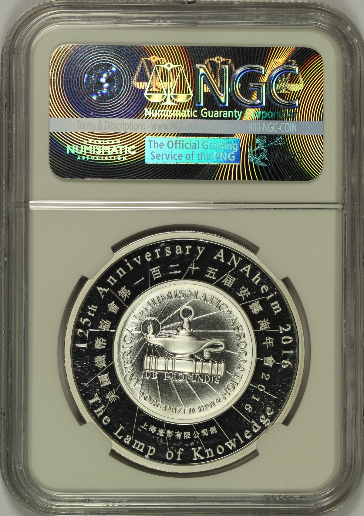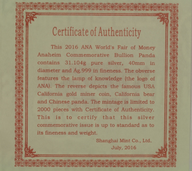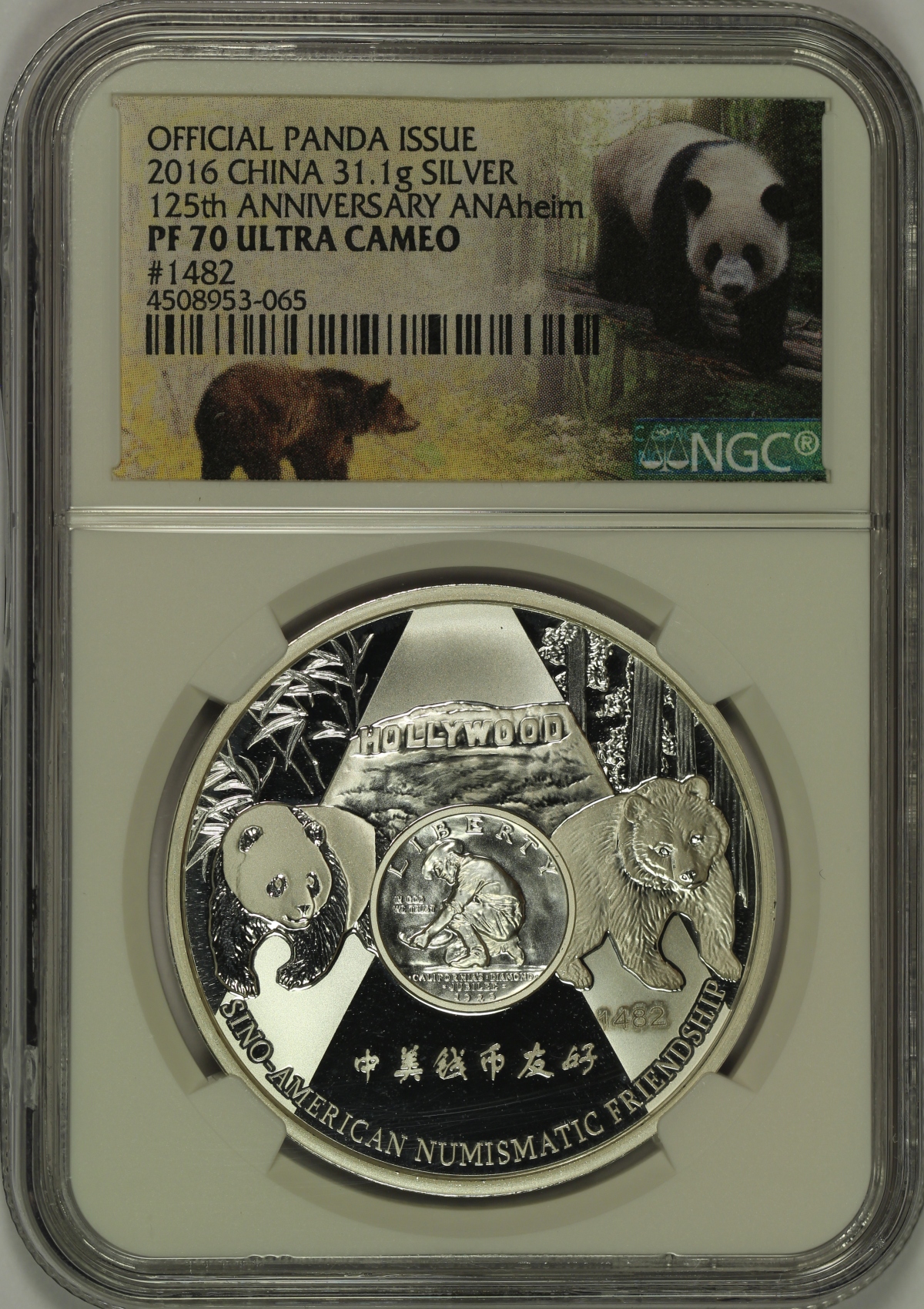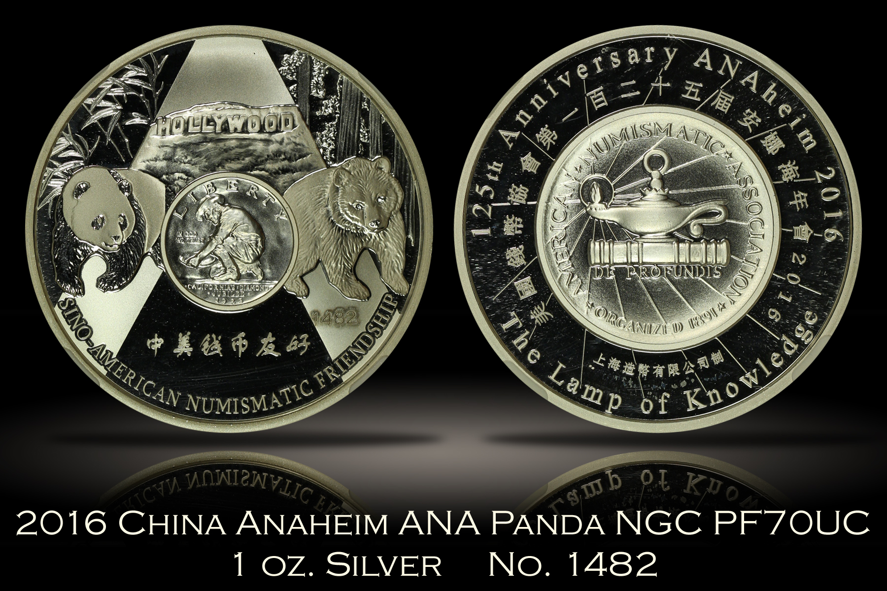| For the 2016 Anaheim ANA World’s Fair of Money, China issued a special commemorative silver proof panda medal to celebrate the show and the 125th anniversary of the American Numismatic Association. A limited number of these medals were sold at the show each day and were quickly sold out at each offering. A total of 2,000 one ounce silver medals were minted and each was individually numbered. The obverse has a wonderful design featuring the obverse of the 1925 California Commemorative Half Dollar, the famous Hollywood sign, a Panda bear and a California Brown Bear. The reverse design features the ANA logo of the Lamp of Knowledge. This example of the 2016 China Panda Anaheim ANA Silver Medal has been graded PF70 Ultra Cameo by NGC and is encapsulated in a newer-style edge-view holder. This example is medal number 1482 and the original certificate of authenticity with matching serial number is included. As the grade suggests, this medal appears to be free of any issues of note and has wonderful overall eye appeal. A beautiful example of this popular piece from the 2016 Anaheim ANA show with a perfect grade.