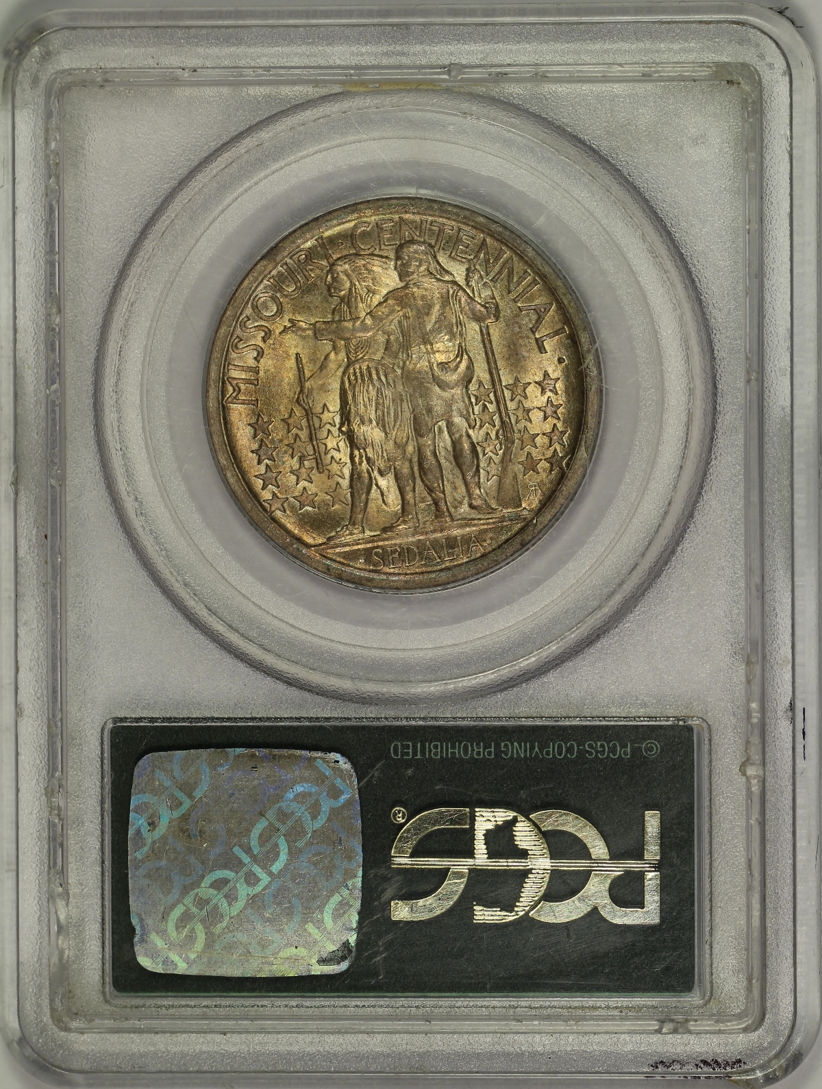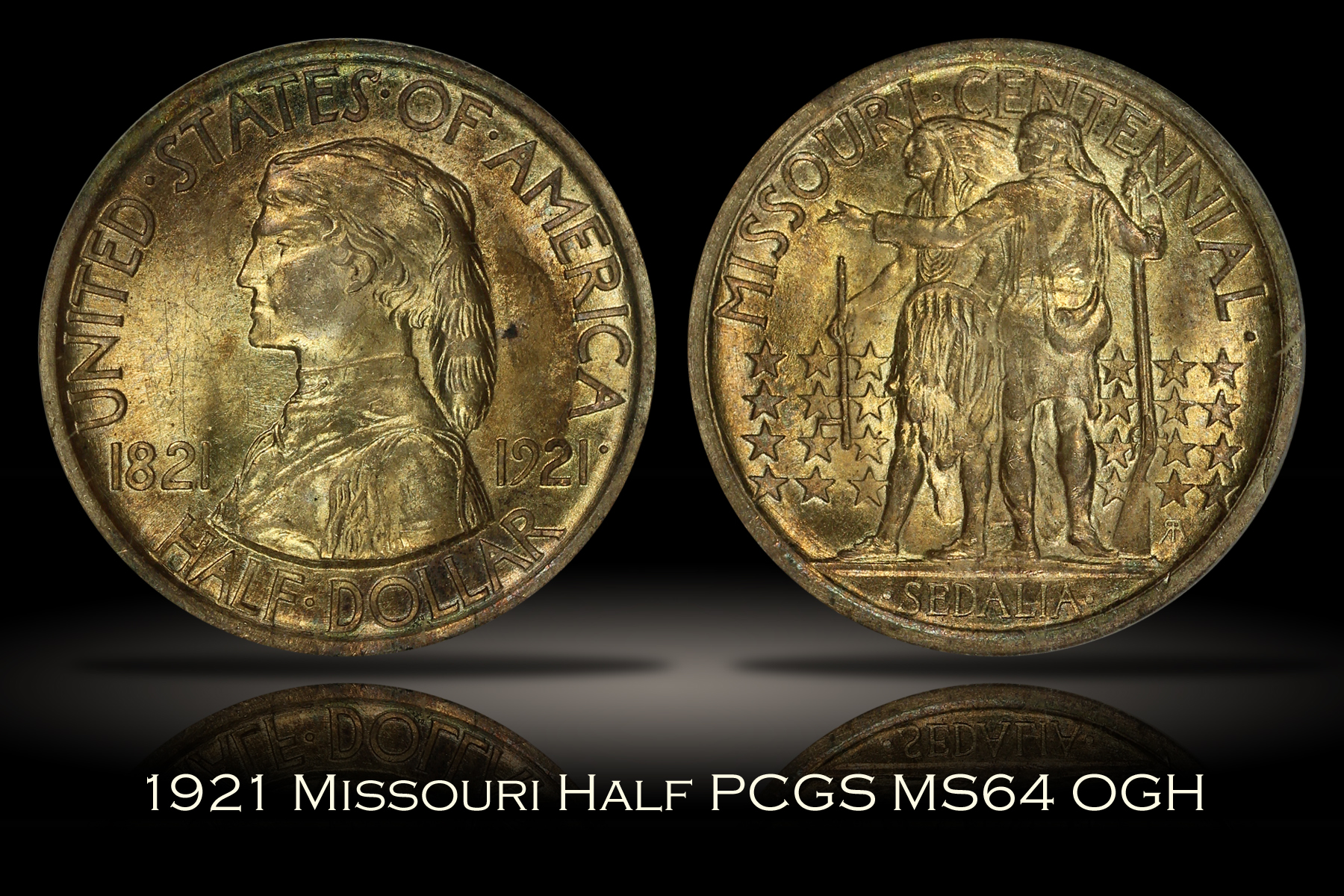 | The Missouri Centennial Commemorative Half Dollar has 24 stars on the reverse, indicating that Missouri was the 24th state admitted to the Union. The Missouri half is also the only commemorative half dollar, other than the Columbian Commemorative Half Dollar, to lack all three mottos; “In God We Trust,” “E Pluribus Unum” and “Liberty.” This 1921 Missouri Centennial Commemorative Half Dollar has been graded MS64 by PCGS and is encapsulated in an old green label holder which is approximately twenty years old. The coin has light to moderate toning on both sides that is a mostly golden color. The coin is well struck and has strong original mint luster. A near-gem example of the Missouri commemorative in an old PCGS holder with a very original look. |