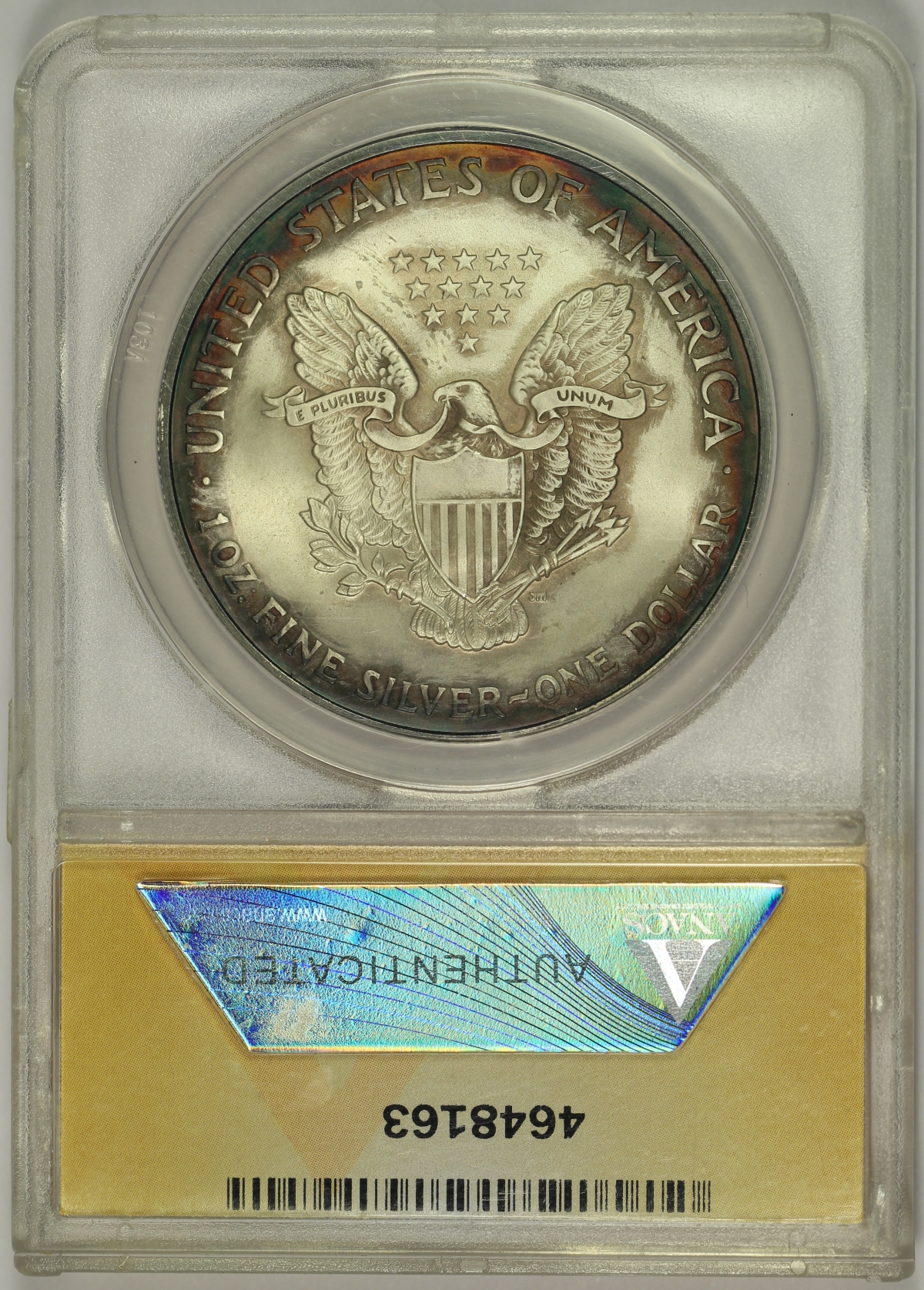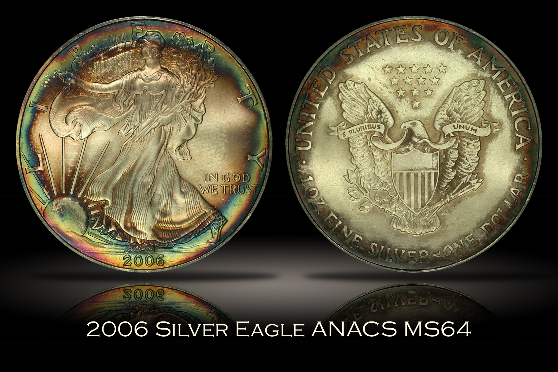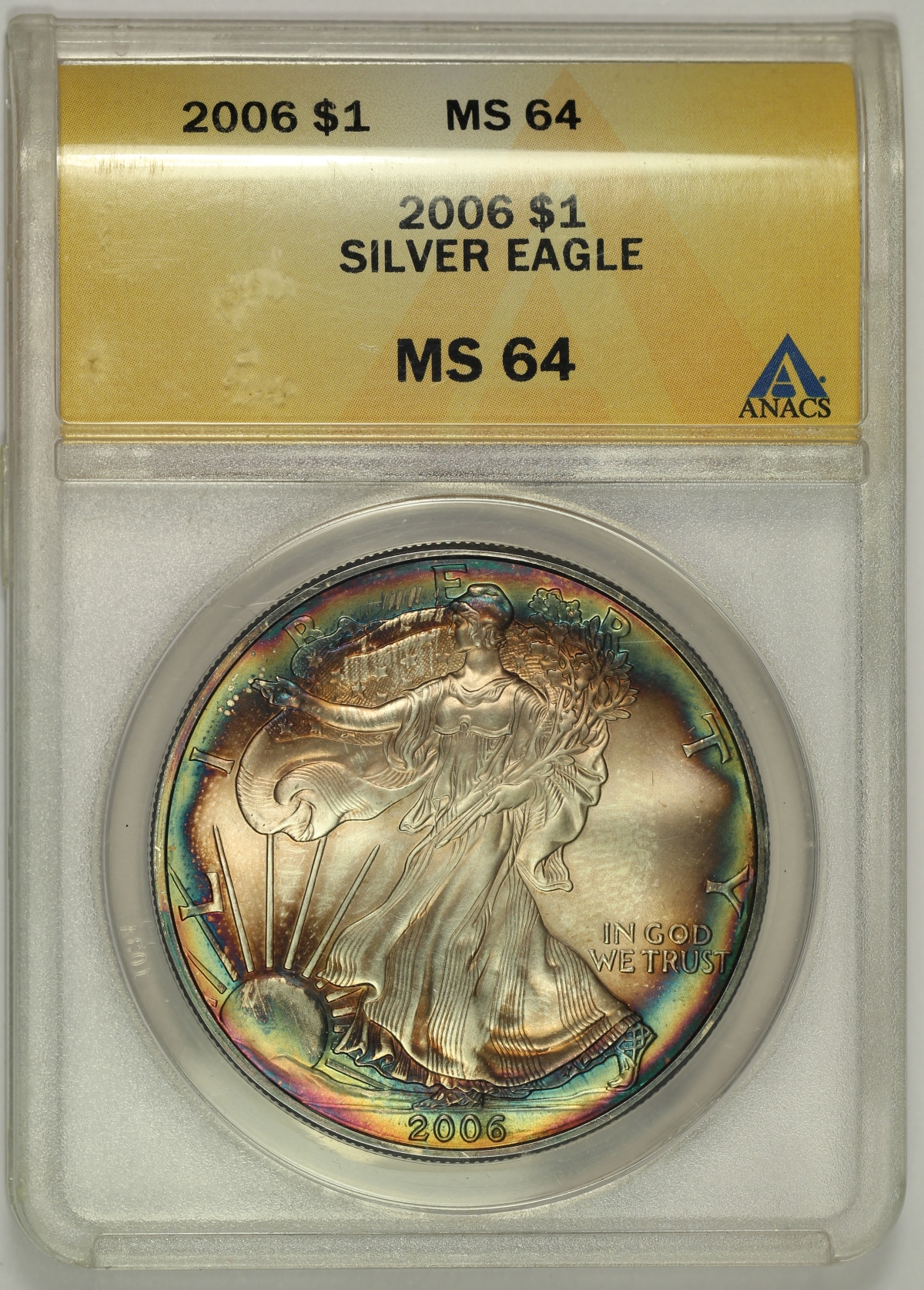 Here is a toned one ounce .999 fine 2006 Silver Eagle which has been graded MS64 by ANACS. The coin has colorful rainbow toning along the rims on both sides that is quite appealing, especially on the obverse side where the color is somewhat more vibrant. The luster of the coin is slightly muted and the toning is slightly uneven, particularly on the reverse side, which likely limited the numerical grade of the coin. An attractive example of the 2006 Silver Eagle. |