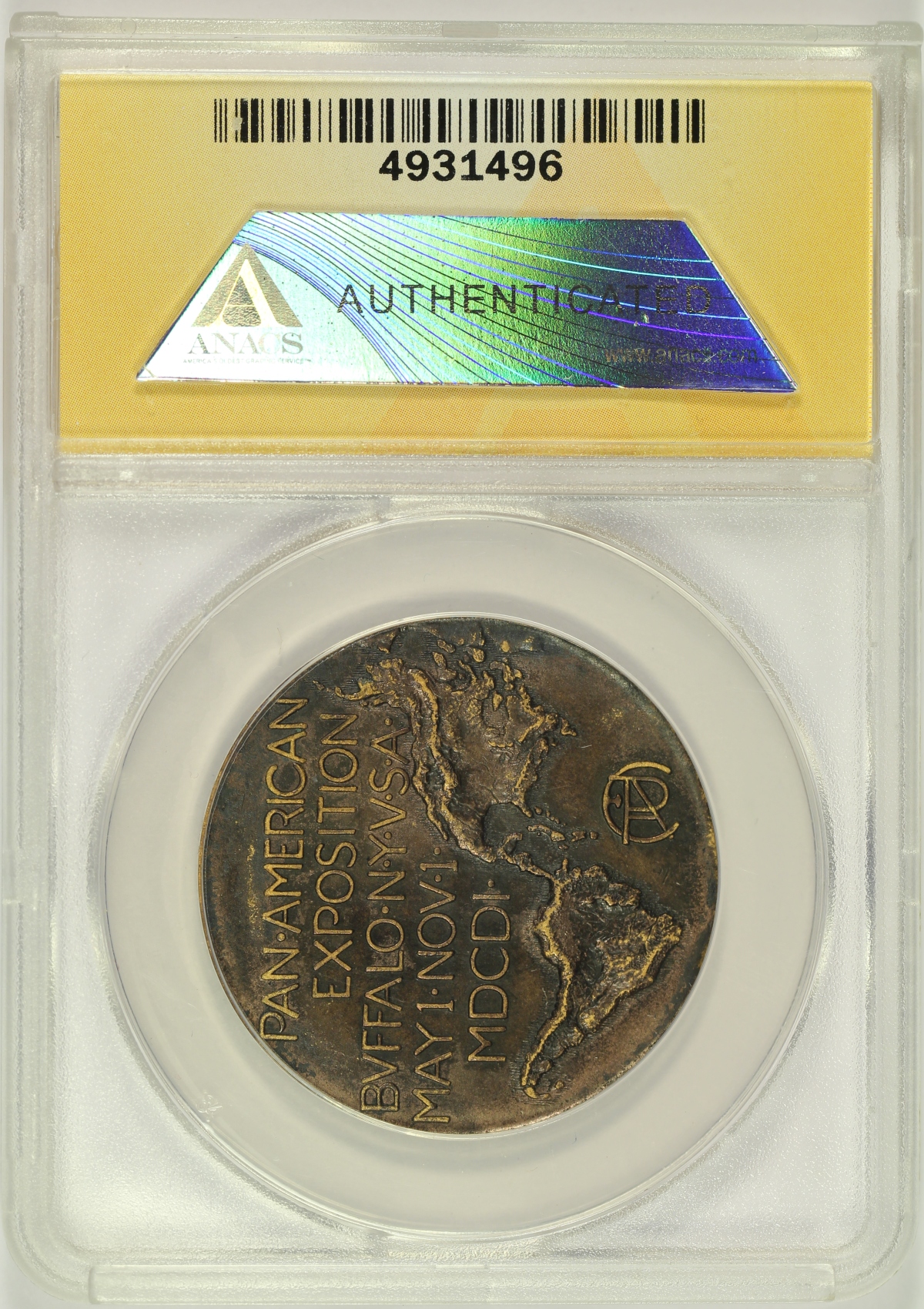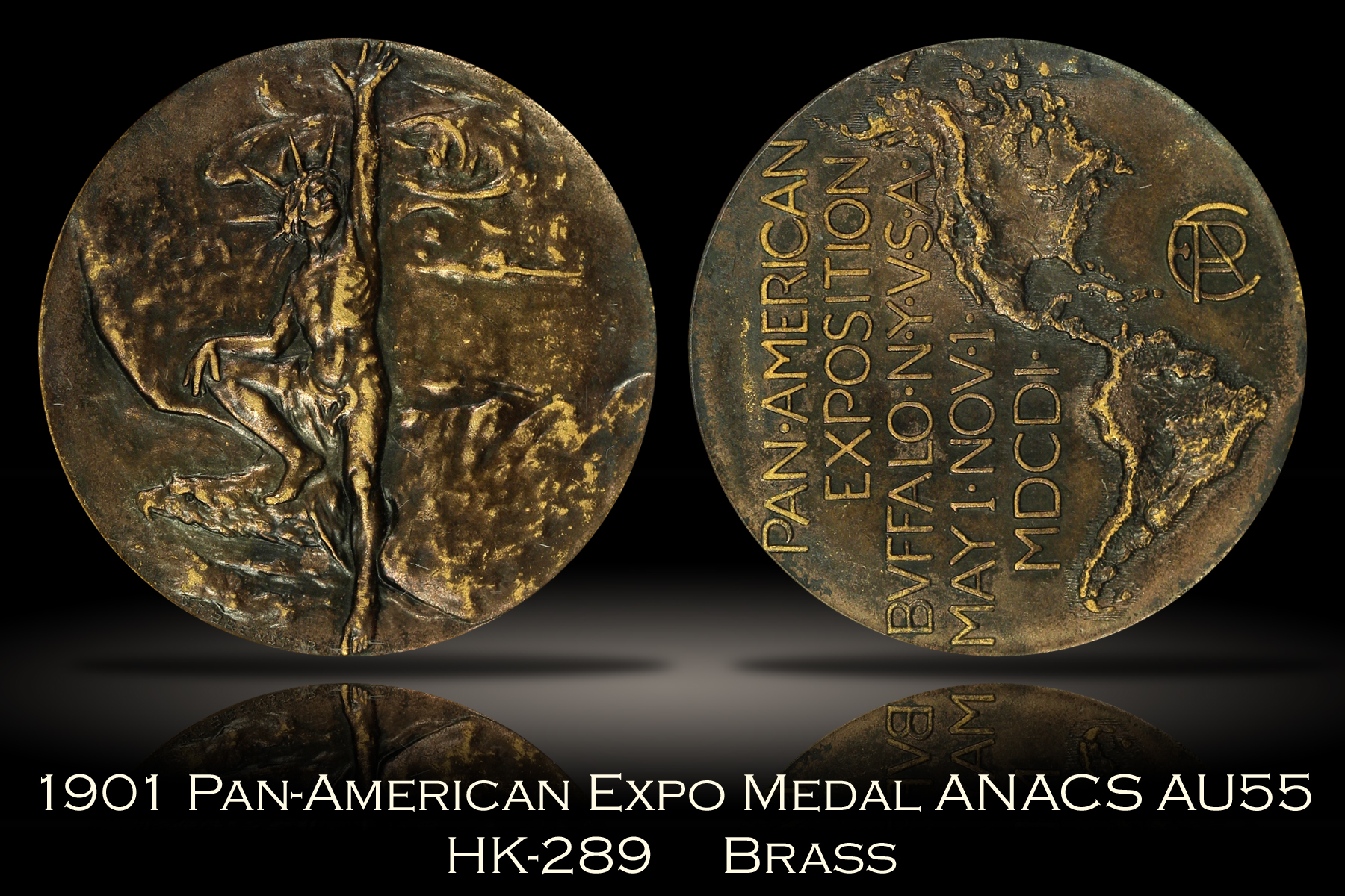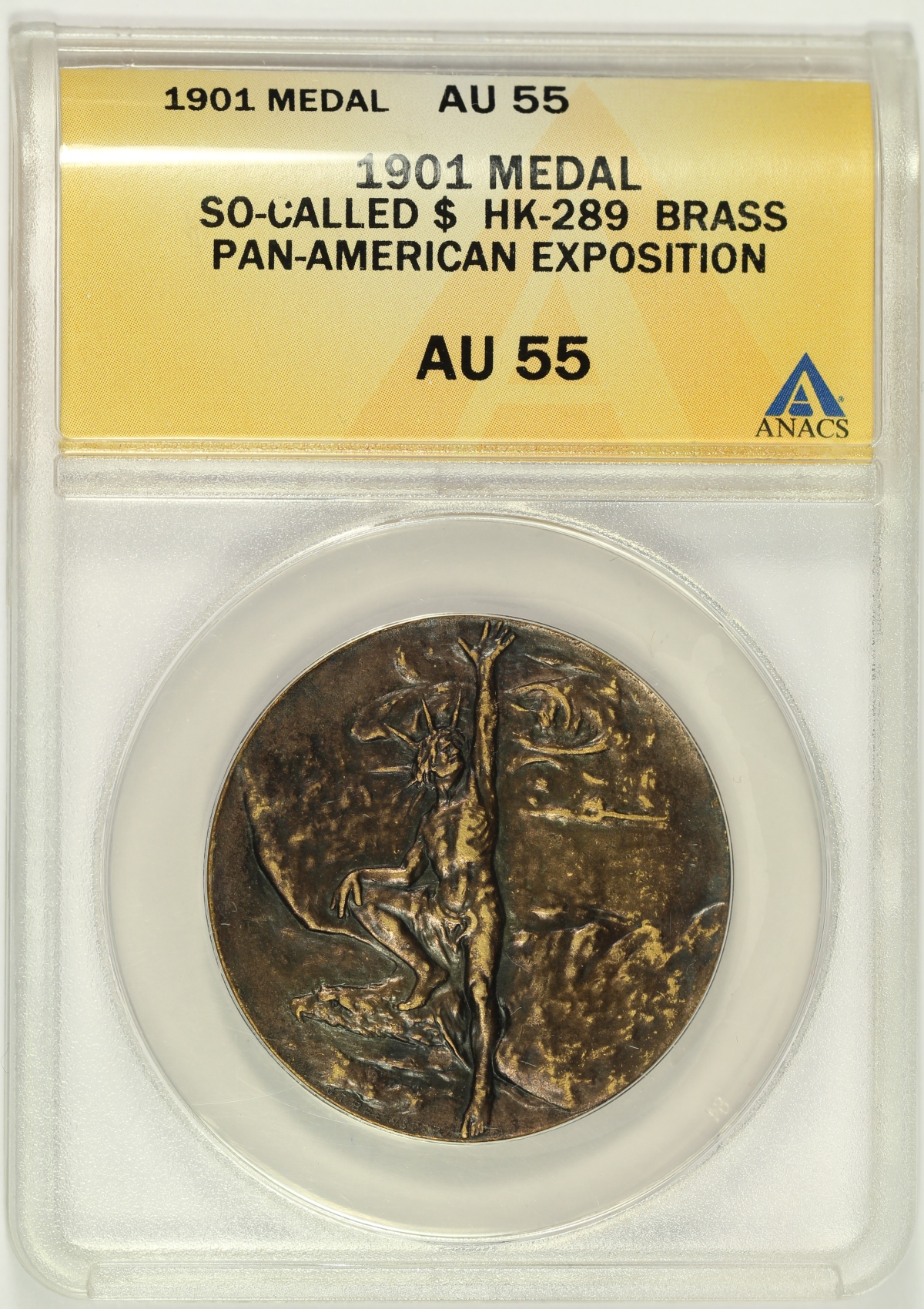 | The 1901 Pan-American Exposition Official Medal was produced for the 1901 Pan-American Exposition held in Buffalo, New York. The exposition was very well attended, but is most famous for being the setting of President McKinley’s assassination in September 1901. These official souvenir medals were struck in various metal compositions including silver, copper and brass. All of these official medals were struck at the Mint Exhibit located on the fairgrounds. This example of the 1901 Pan-American Exposition Official Medal was struck in brass and is listed as HK-289 in the Hibler-Kappen reference on So-Called Dollars. This 1901 HK-289 Medal has been graded AU55 by ANACS. Despite the light circulation wear on the high points, this piece has really nice overall eye appeal. The color of the medal is slightly dark, with the high points of the design with light rub appearing slightly higher which helps to highlight the detailed design of this popular piece. |