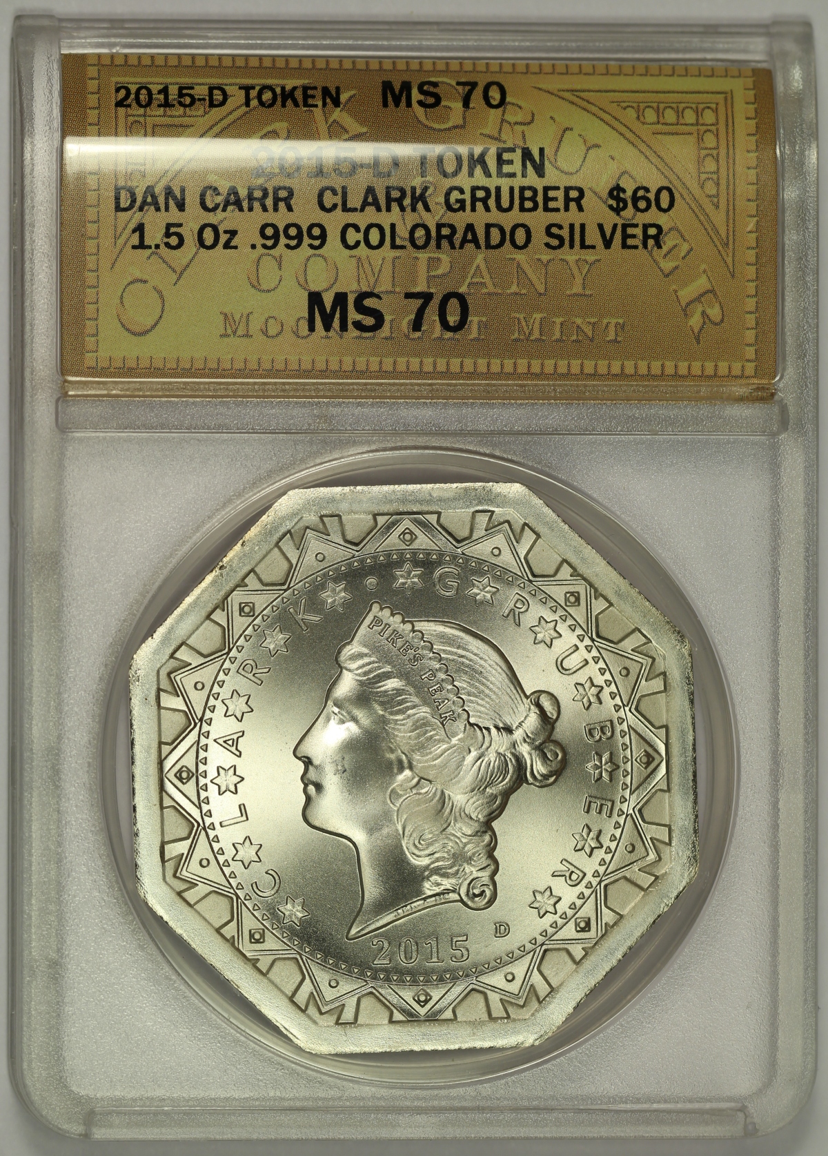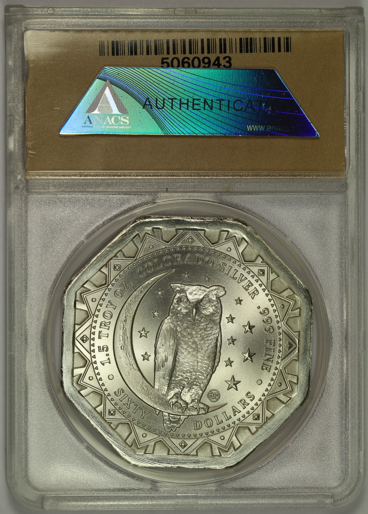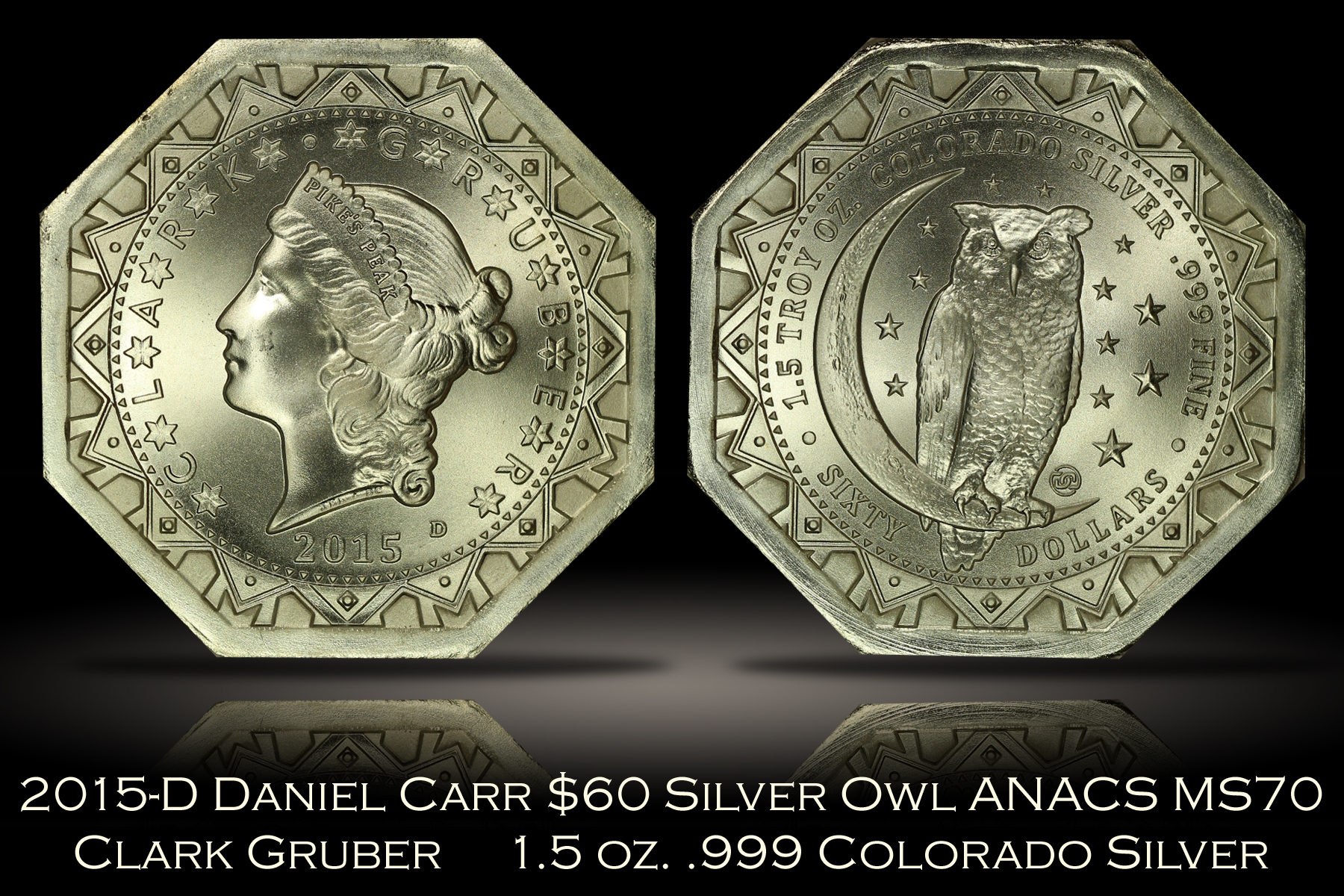 The 2015-D Clark Gruber $60 1.5 oz. Octagonal Silver Owl was issued minted and issued by Daniel Carr of the Moonlight Mint. This large octagonal silver piece is beautifully designed and the total mintage of only 95 pieces sold out very quickly. This example of the 2015-D Clark Gruber $60 1.5 oz. Octagonal Silver Owl has been graded MS70 by ANACS and features the special Clark Gruber & Company labeling. As the grade suggests, the coin is free of any noticeable flaws or imperfections. The design is quite detailed with the impressive Liberty head on the obverse and the spectacular owl on the reverse. Please note that in the photos there appears to be a spot on the highest point of Liberty’s cheek. However, that is actually the surface of this thick silver coin pressed up against the inside of the plastic slab and is not a spot on the coin itself. A beautiful and eye appealing silver coin with a mintage of only 95 pieces and a perfect grade.