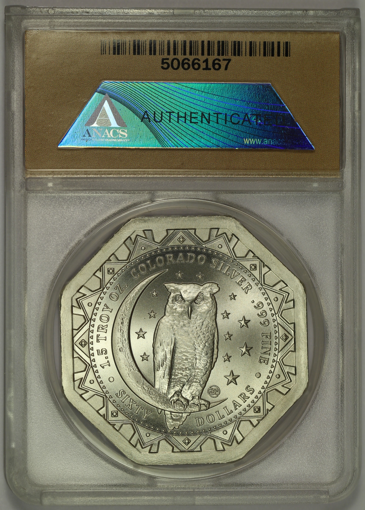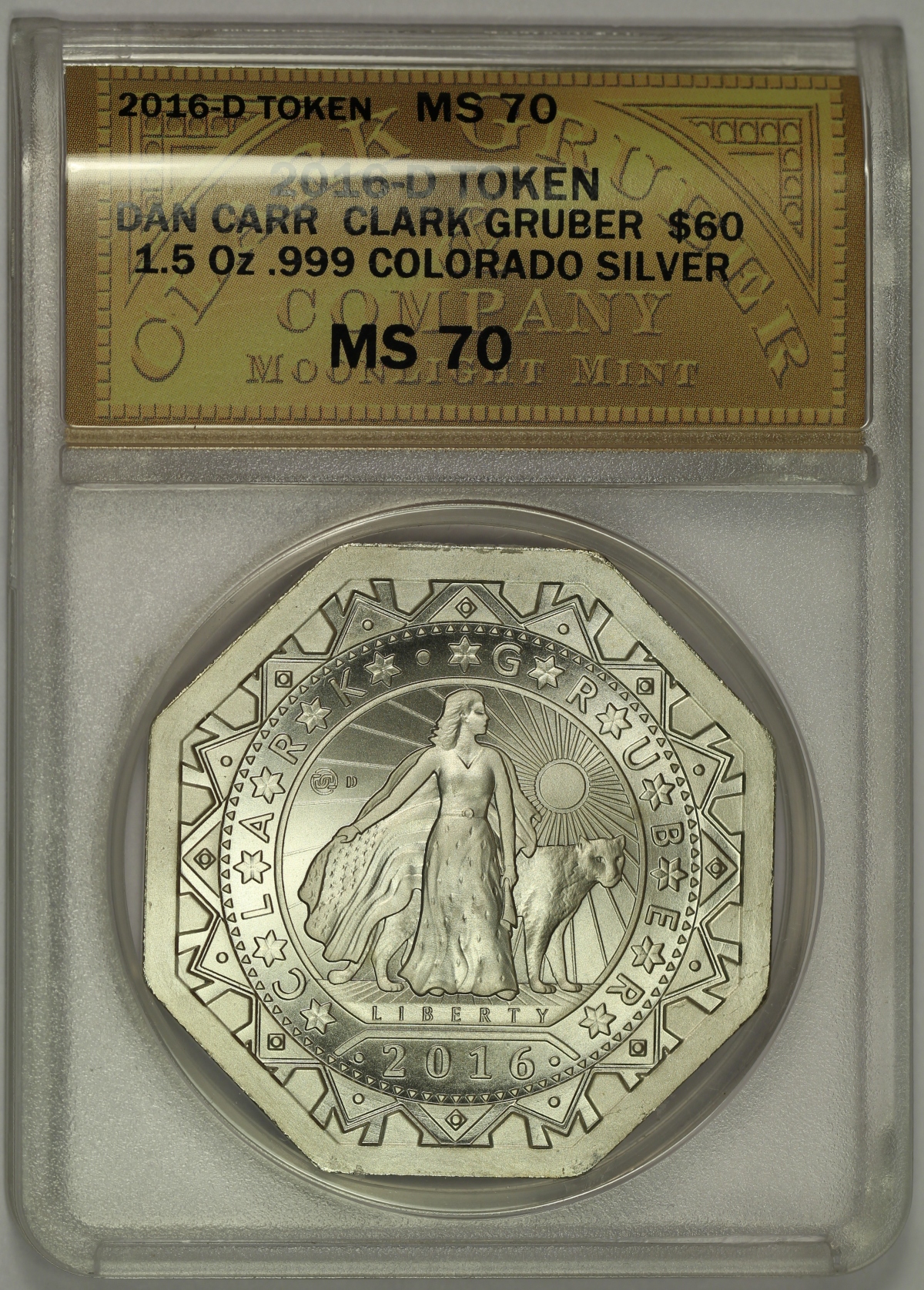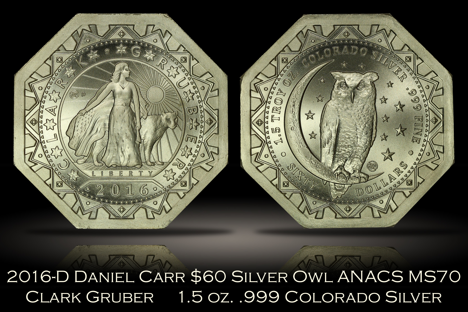 The 2016-D Clark Gruber $60 1.5 oz. Octagonal Silver Owl was issued minted and issued by Daniel Carr of the Moonlight Mint. This large octagonal silver piece is beautifully designed and the total mintage of only 138 pieces sold out very quickly. This example of the 2016-D Clark Gruber $60 1.5 oz. Octagonal Silver Owl has been graded MS70 by ANACS and features the special Clark Gruber & Company labeling. As the grade suggests, the coin is free of any noticeable flaws or imperfections. The design is quite detailed with the impressive standing liberty with puma on the obverse and the spectacular owl on the reverse. A beautiful and eye appealing silver coin with a mintage of only 138 pieces and a perfect grade.