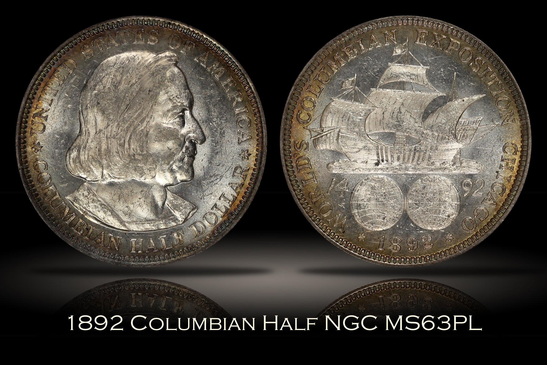 The World's Columbian Exposition Commemorative Half Dollars are widely accepted as the first U.S. commemorative and the first in the widely collected classic commemorative series. However, some argue that the 1848 CAL. quarter eagles were really the first U.S. commemoratives. The Columbian Exposition Half Dollars were also the first United States coin of regular issue to depict an actual historical person, Christopher Columbus. The silver used to coin many of the Columbian Half Dollars came from the melting of then uncurrent coins which were pulled from circulation and held by the Treasury, many of which were half dimes last minted in 1873. The Columbian Half Dollars were minted for two years, 1892 and 1893. This example is an 1892 Columbian Half Dollar which has been graded NGC MS63PL. The proof-like designation assigned to this coin is well-deserved and somewhat rare to find in the classic commemorative series. This coin has relatively strong proof-like reflective mirrored fields and frosty devices. Some rim toning ins present around the outer edges of each side adding to the eye appeal. The prooflike fields reveal many small hits and marks that have limited the numerical grade of the coin. An excellent prooflike example of the commemorative Columbian Half Dollar. |