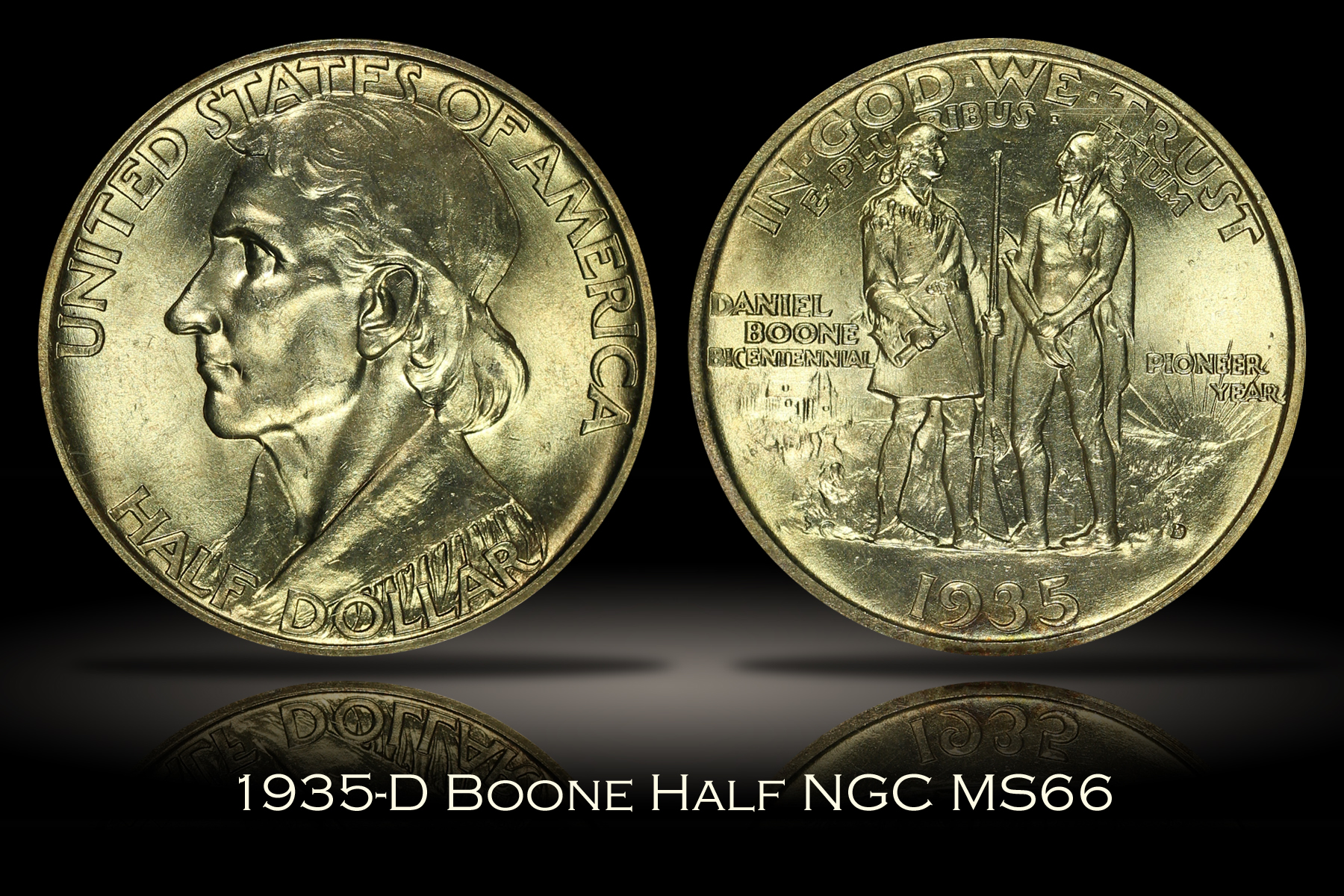 | The 1935-D Daniel Boone Bicentennial Commemorative Half Dollar had a total mintage of only 5,005 coins, which is a relatively small total mintage when compared to many others in the classic commemorative series. This example of the 1935-D Daniel Boone Bicentennial Commemorative Half Dollar has been graded MS66 by NGC. The coin is bright white and lustrous with only a few tiny marks which are noticeable under a close inspection. This is a wonderful high-grade example of one of the more popular classic commemorative half dollar designs. |