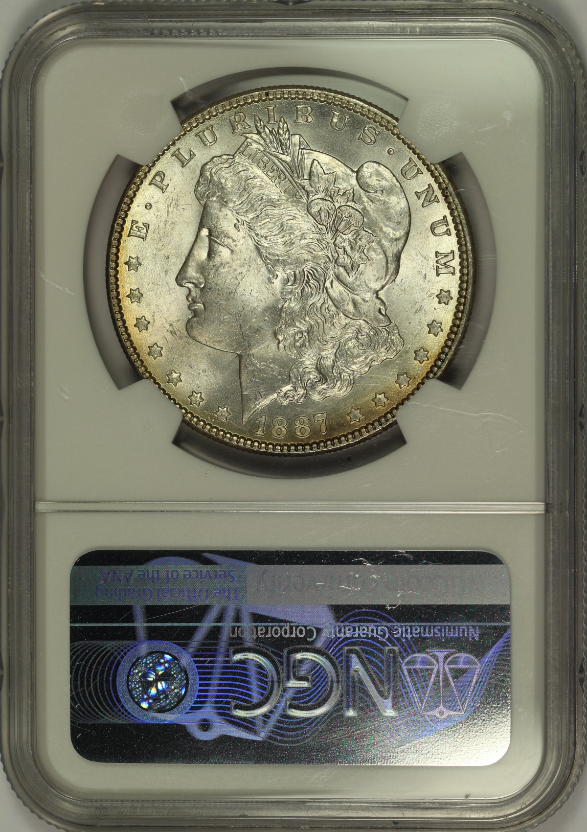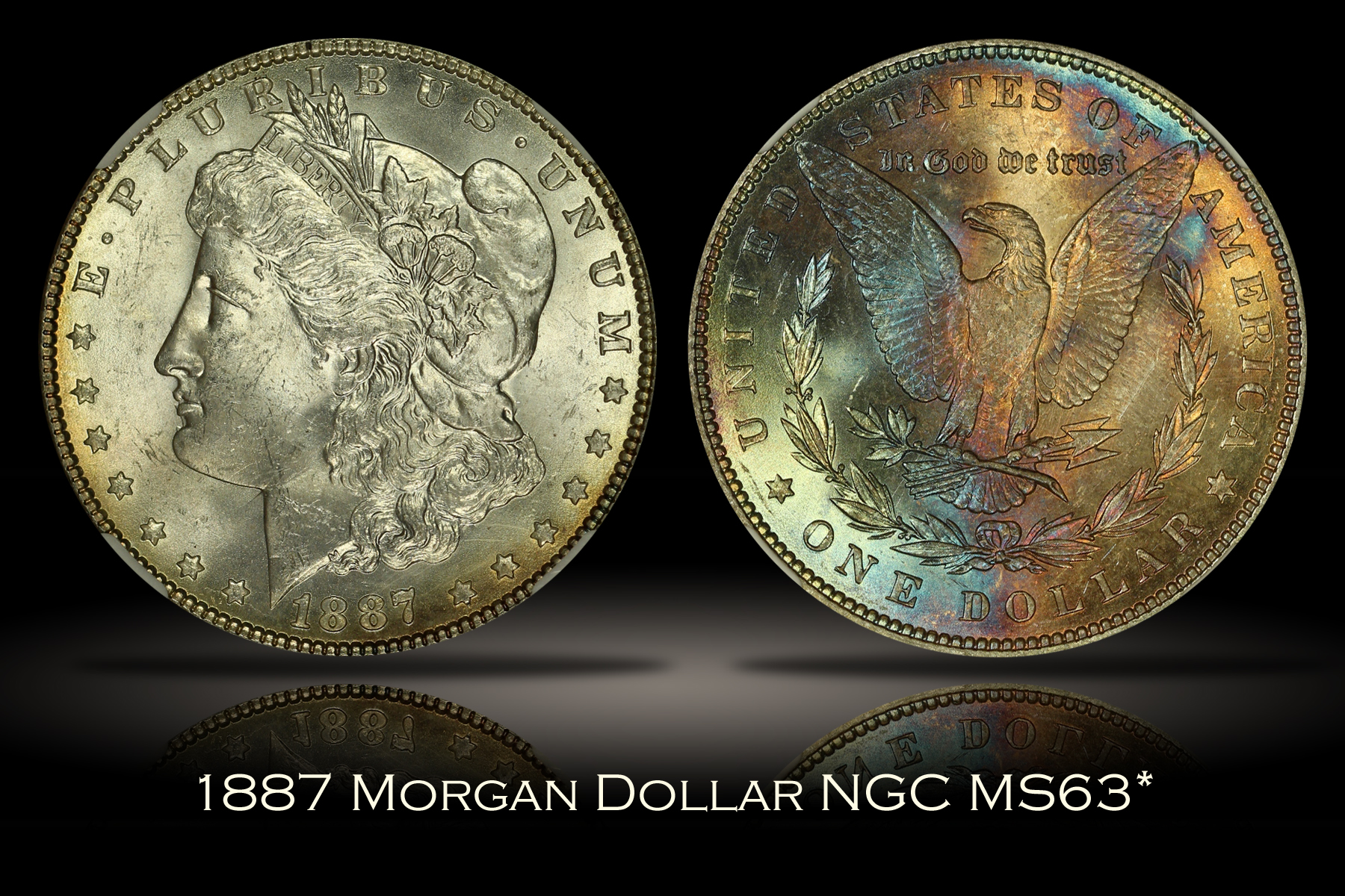 | This 1887 Morgan Silver Dollar has been graded MS63* by NGC and is encapsulated in one of the newer-style edge-view holders. The star designation is given by NGC to coins with exceptional eye appeal. The coin has also been holdered with the reverse facing front to show off the strong colorful toning that covers the entire reverse of the coin. The reverse is boldly toned in vibrant orange, blue and light green colors. Strong original mint luster cartwheels around both sides of the coin as well, helping to make that reverse color that much more eye appealing. The obverse is mostly untoned with just a touch of golden color at parts of the rim. As the grade would suggest, the coin has several marks and hits mostly focused on the high points of the obverse, but nothing too major and all appropriate for the assigned grade. An attractively toned and eye appealing example of the Morgan Dollar. |