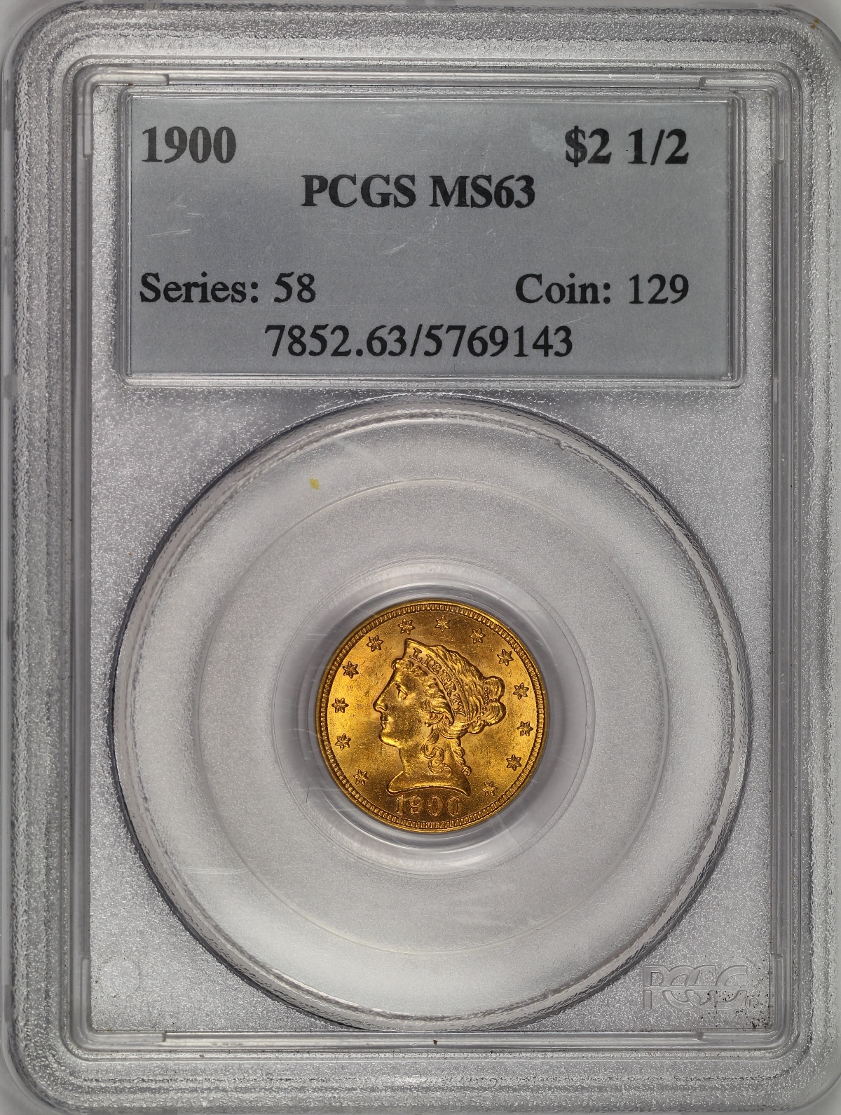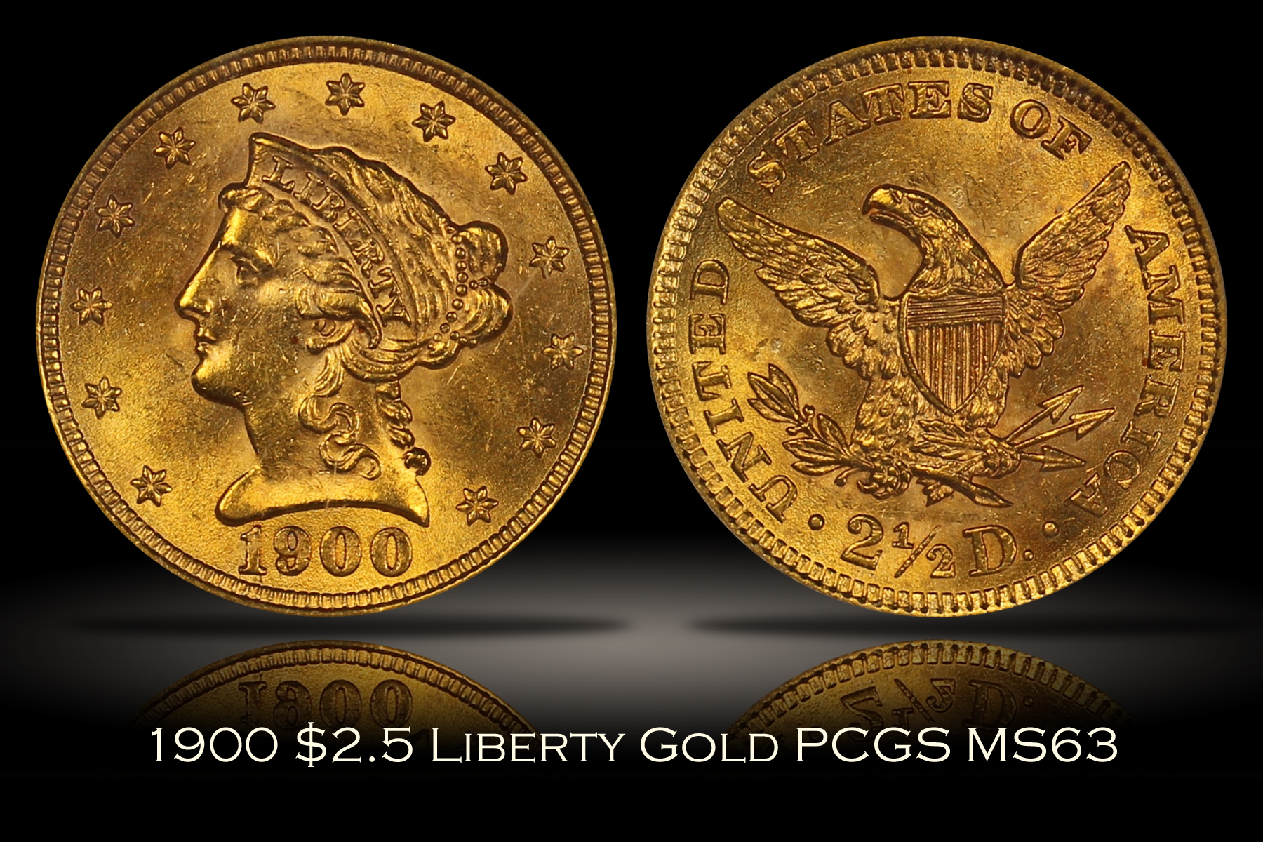 Here is a1900 $2.5 Liberty Gold Quarter Eagle has been graded MS63 by PCGS. The coin has very strong original cartwheel luster on both sides with excellent bright color too. There are several small marks and hits, including some on the profile of Liberty, that certainly limited the technical grade of the coin. An excellent choice uncirculated example of the type. |