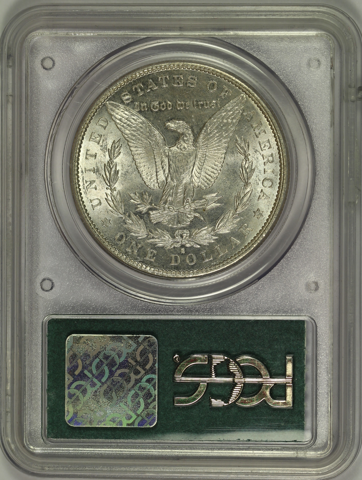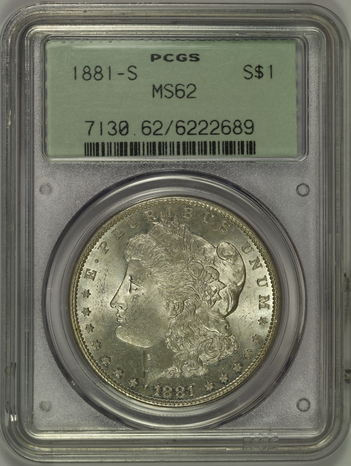 | This 1881-S Morgan Silver Dollar has been graded MS62 by PCGS and has been encapsulated in an old green-label holder which is over twenty-five years old. The coin is bright white and lustrous on both sides with a light haze over the surfaces that may have prevented a higher grade. While there are some light hits and marks on each side, the coin is very nice for the assigned grade. More importantly, this coin is encapsulated in a relatively scarce PCGS holder which is referred to by many as the Generation 2.5 holder (and is cataloged as Generation 2.1 in the PCGS Museum of Coin Holders featured on their website) only produced for a very short time at the end of 1989. This version 2.5 holder is an older-style two-piece holder with an inner part that is similar to an old rattler style slab which is surrounded by an outer stacking ring. Note that the label of the Generation 2.5 holder has a perforated edge and “PCGS” centered at the top, unlike the Generation 2.0 holder which does not have “PCGS” at the top of the label. The holder itself is in good condition without no breaks and just a few minor inclusions in parts of the edge of the outer stacking ring. An overall nice Morgan Silver Dollar in the somewhat rare and short-lived PCGS holder. |