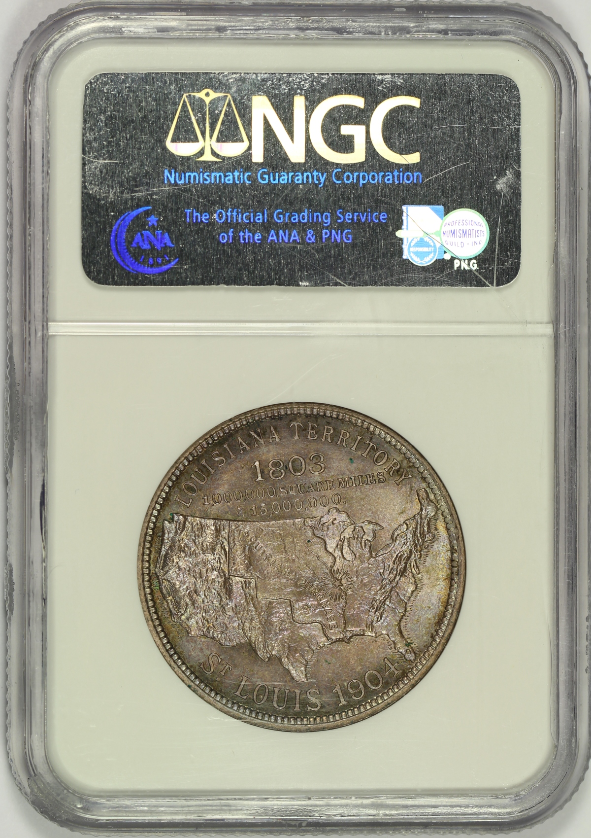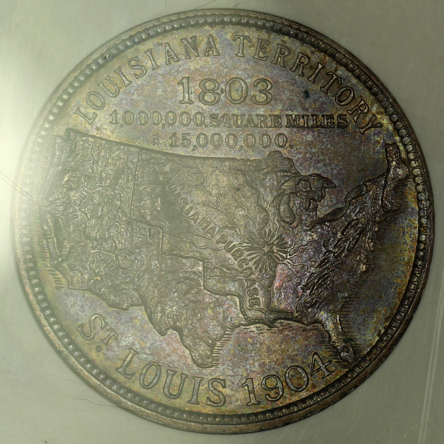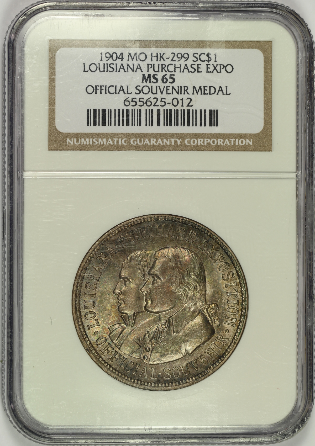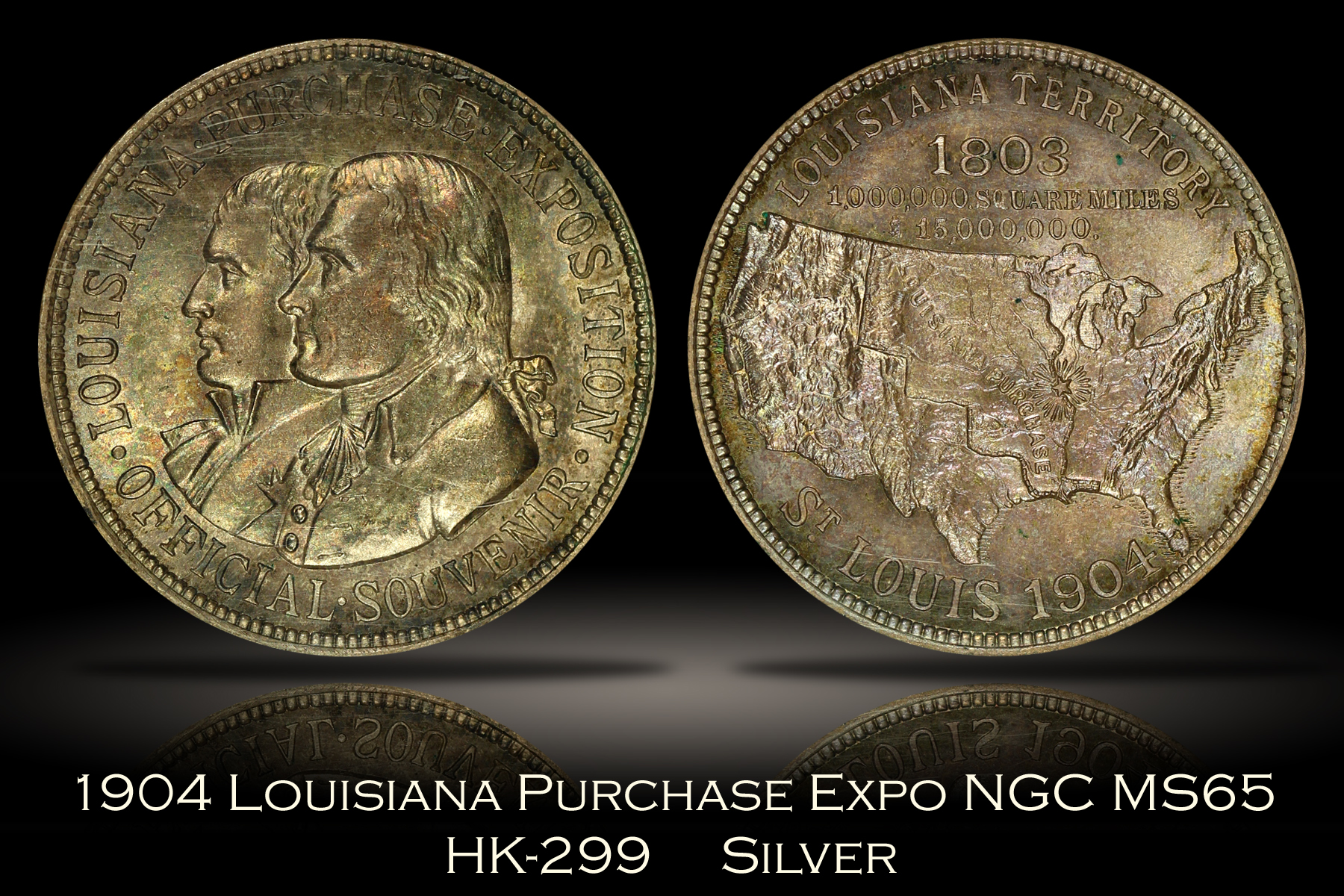 | The 1904 Louisiana Purchase Exposition Official Souvenir Medal was produced for the 1904 St. Louis fair where the centennial of the Louisiana Purchase was celebrated. These official souvenir medals were struck in various metal compositions including silver, gold, gold-plated bronze, copper, yellow-bronze, bronze and gilt. They were designed by George Morgan and his initial M appears at the base of Jefferson’s shoulder. Approximately 90,000 medals were struck in total at the Mint Exhibit located on the fairgrounds. This example of the 1904 Louisiana Purchase Exposition Official Souvenir Medal was struck in silver and is listed as HK-299 in the Hibler-Kappen reference on So-Called Dollars. This 1904 HK-299 Medal has been graded MS65 by NGC. The medal is moderately toned on both sides in a medium grey color on the obverse and in a purple, green and golden color on the reverse. The color does not show well in my photos but the piece comes to life with impressive color when tilted into a direct light. A few light marks can be found on the high points of the piece, particularly on the obverse portraits of Jefferson and Napoleon, but none are major. A terrific gem example of this desired so-called dollar and official silver medal from the Louisiana Purchase Exposition. |