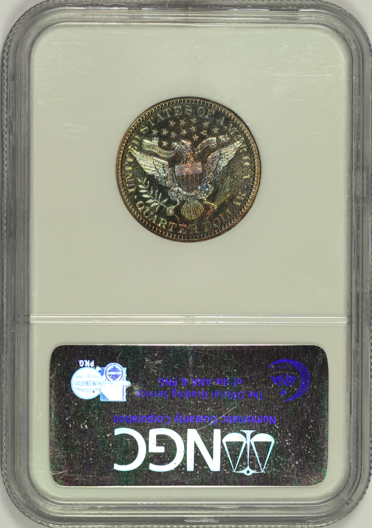 | Hands down, this is one of the most spectacular proof Barber Quarters I have seen. This 1914 Proof Barber Quarter has been graded PF68* by NGC. The star designation is given by NGC to coins with exceptional eye appeal. Sometimes, you will see coins on the market that have received the star designation from NGC and you may wonder why as the coin may seem relatively average. That is not the case with this coin as it is easily deserving of the NGC star for exceptional eye appeal. The color of the coin is amazing and completely covers both sides. Capturing that color accurately in a single image is nearly impossible given the strongly mirrored proof fields of the coin. I have included several images and a video of the coin to help show you the overall look. The obverse is a mostly green and golden color which deepens to a more blue color in the center of the design and concentrates in an orange and pink band near the rim. The reverse is similarly toned with the colors slightly more vibrant near the center of the design and near the rims. Not only is the toning of this coin impressive, but the ultra high level of preservation of this coin is fantastic. Only a couple of tiny marks can be found on this coin under magnification and some time to try to find them. Only 380 Proof Barber Quarters were minted in 1914 and this example has to be one of the finest overall surviving specimens. There are three (3) examples listed in the NGC Census at PF68* with no examples grading higher. The coin is about as close to the perfect high grade colorfully toned Proof Barber Quarter as you can ever hope for.