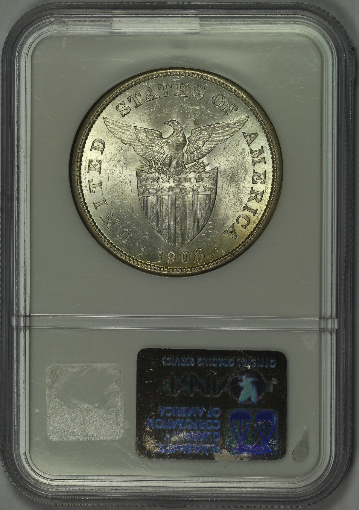 | This coin was minted at the San Francisco Mint for use in the Philippines which were a territory of the United States at the time. Because they were minted for use in a U.S. Territory, minted at the U.S. Mint in the United States and the coins say “United States of America” on them, many U.S. collectors are now starting to collect the U.S. Philippines coinage along with their U.S. coin collections. Even the Red Book of U.S. Coins has expanded their listings of USPI coinage, see pages 415-419 of the 2015 edition. This 1908-S U.S.-Philippines One Peso has been graded MS62 by NGC. This peso has strong and bright cartwheel luster on both sides. The coin is mostly bright white with just a small bit of golden toning on part of the reverse near the rim. The coin is not nearly as dark as the photos came out. There are plenty of small hits and marks scattered about both sides of the coin as you would expect on a coin grading MS62. That said, the coin is a nice well-struck example for the grade and a wonderful example of the type. |