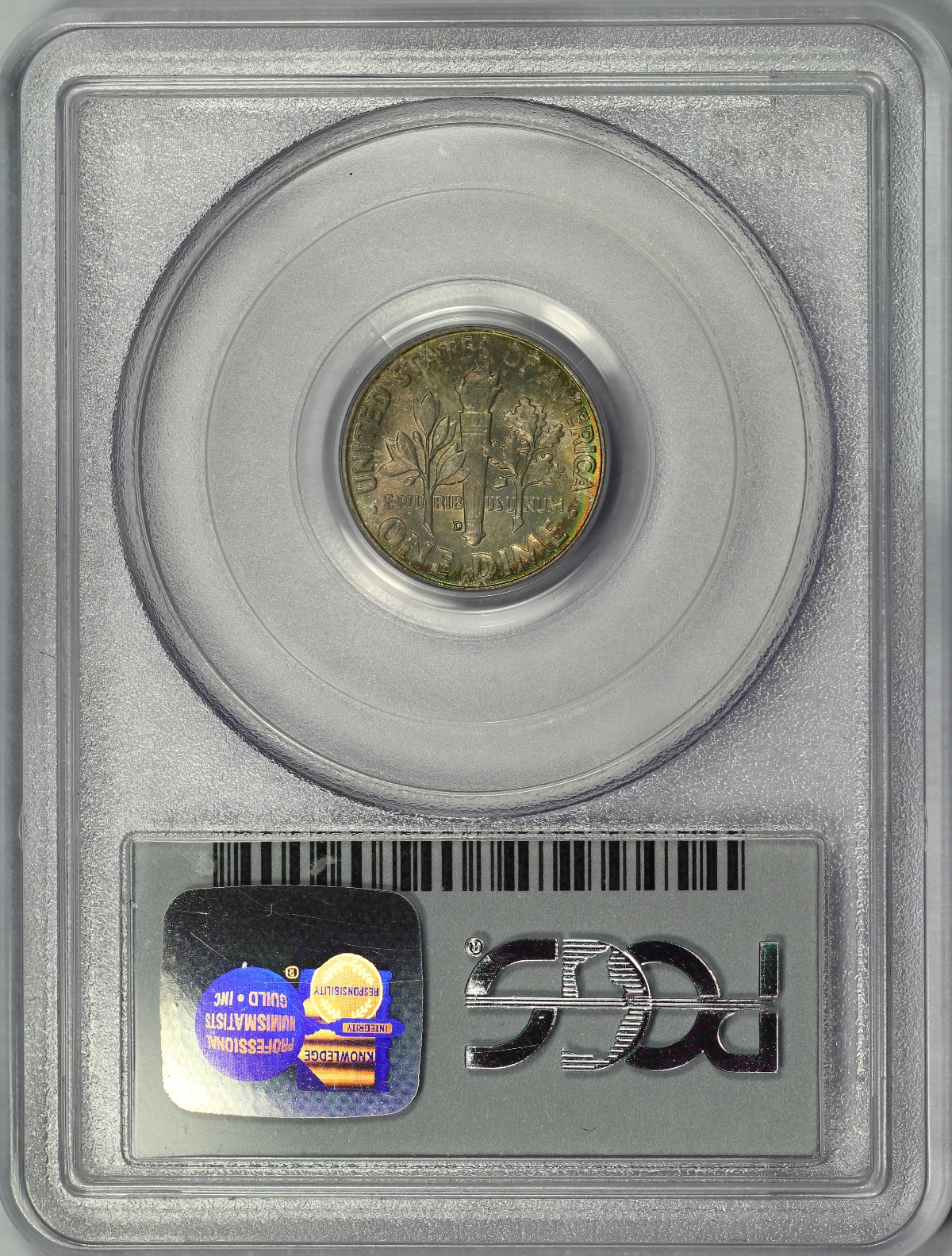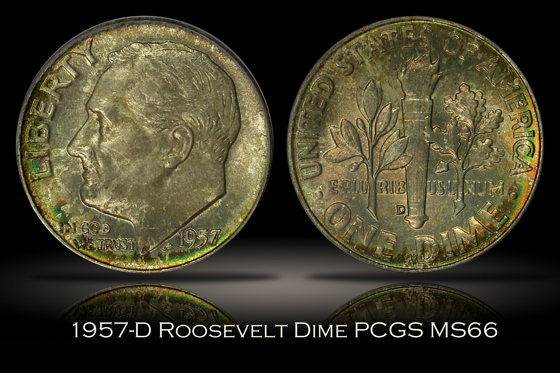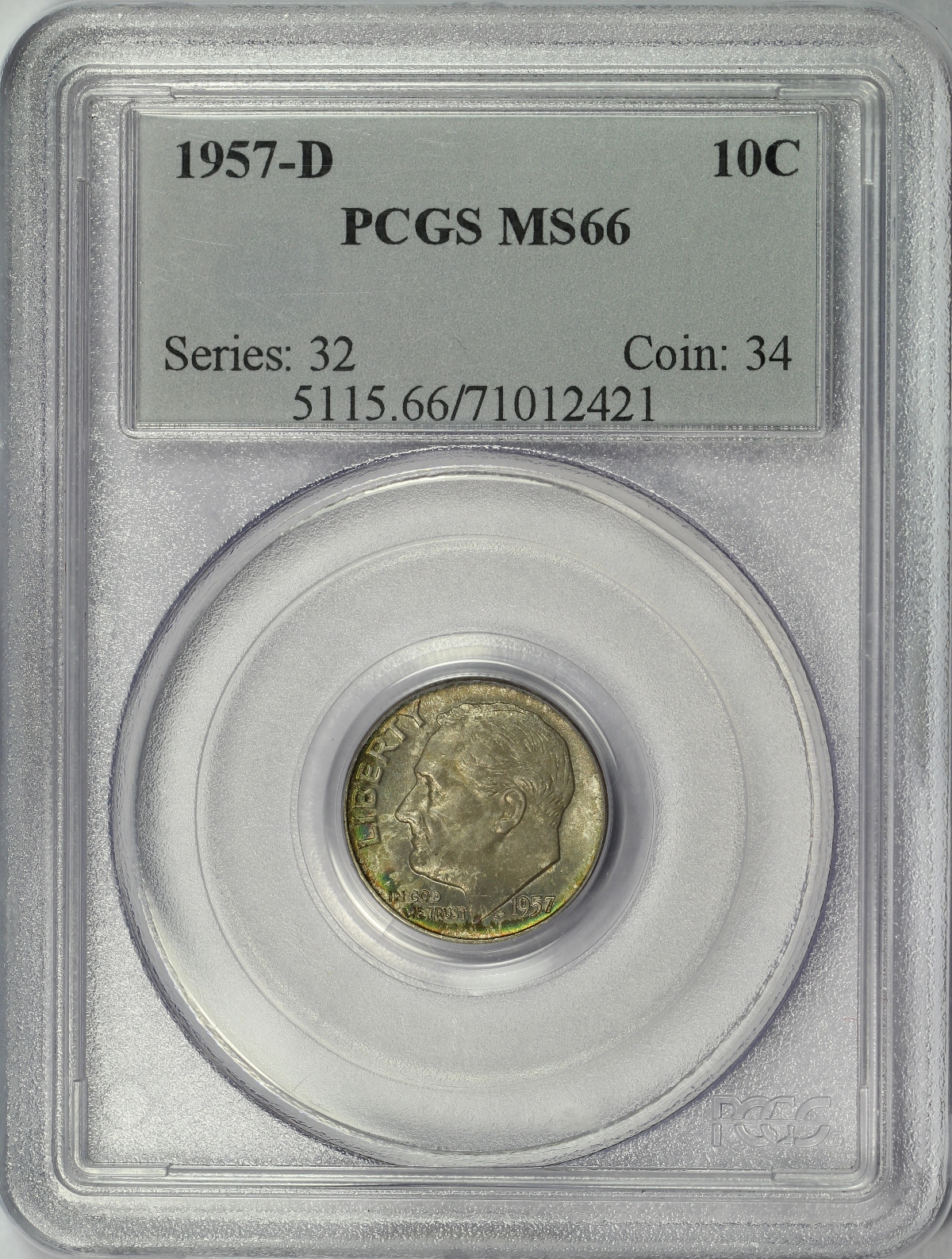 This is a 1957-D Roosevelt Dime which has been graded MS66 by PCGS. Both sides of the coin are toned and the toning is somewhat thick which does mutes the coins original luster somewhat. The toning is mostly an original medium-grey color with some areas of rainbow color near parts of the rims on each side. Just a few light hits are scattered about the coin, but none take away from the overall eye appeal. |