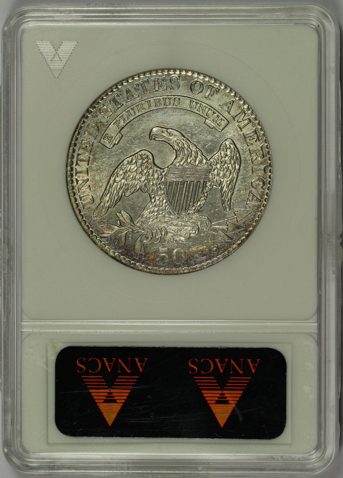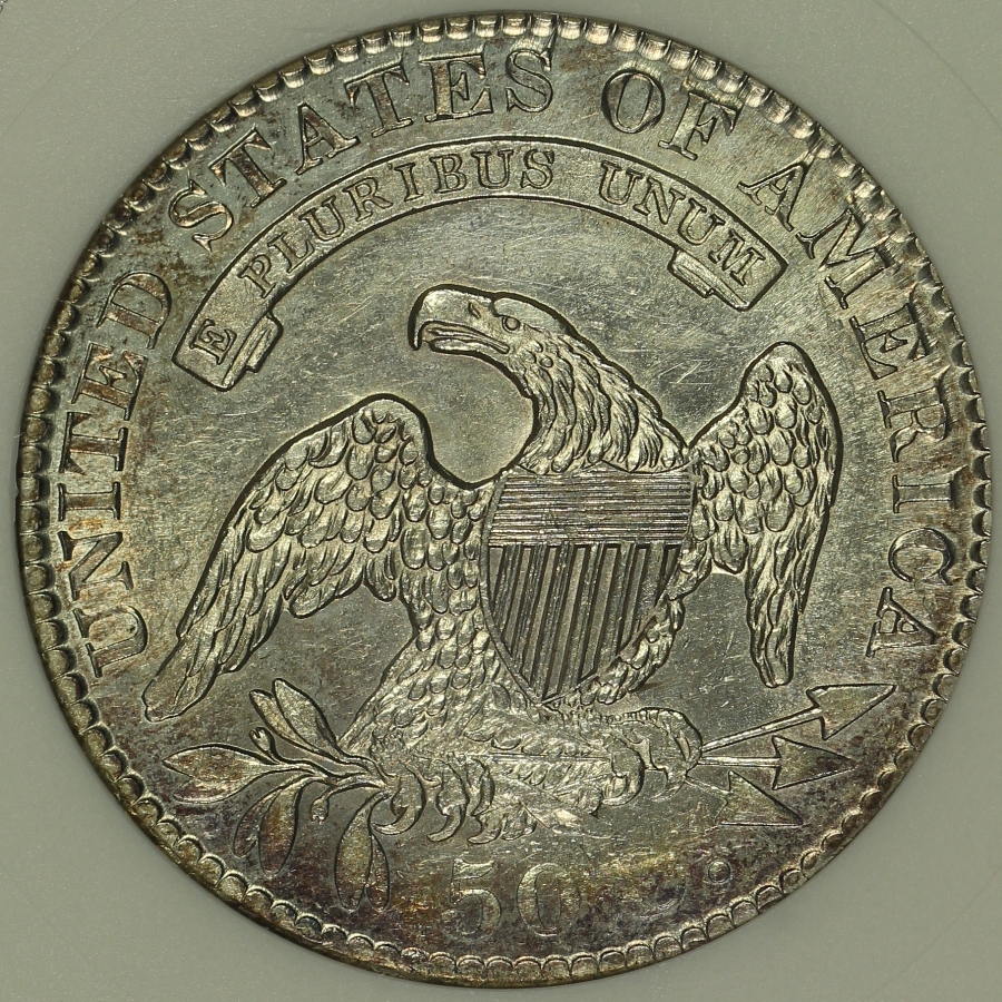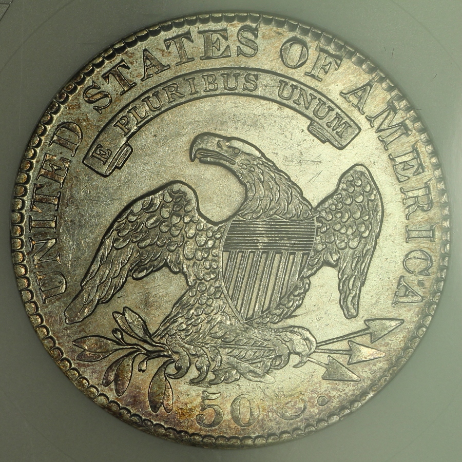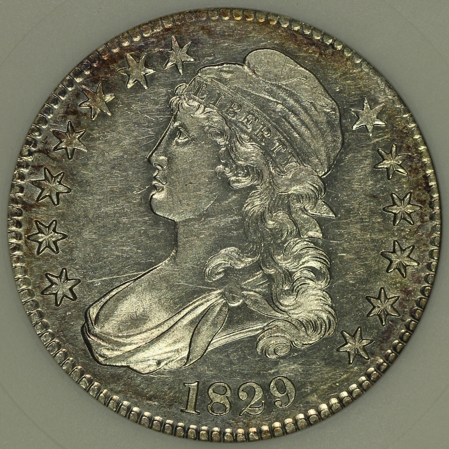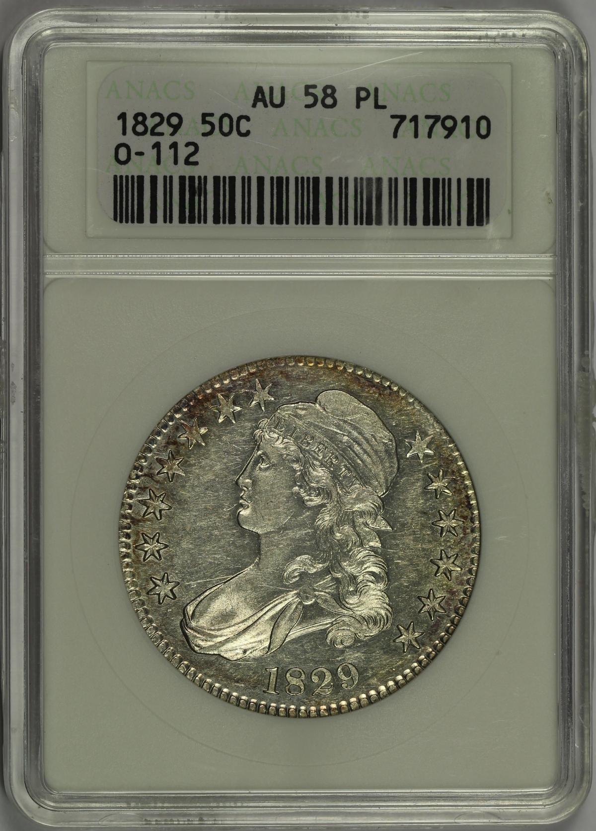 | The 1829 Capped Bust Half Dollar is a relatively common date in the series. However, it is extremely rare to have any Capped Bust Half Dollar which has been certified with a prooflike designation as part of its grade. This 1829 Capped Bust Half Dollar has been graded AU58PL by ANACS and is encapsulated in the older small white ANACS holder from many years ago. The coin is also attributed as the Overton 112 variety, which is one of the common varieties. Of all of the Capped Bust Half Dollars graded by ANACS in its 30+ year history of grading coins, only seventeen (17) examples have been awarded the prooflike (PL) designation, including the coin offered here, and another three (3) coins have been awarded a deep mirror prooflike (DMPL) designation. At NGC, only thirty-nine (39) examples of the over 40,000 Capped Bust Half Dollars graded by the company have been awarded the PL designation. PCGS does not currently use the PL designation on the Capped Bust Half Dollar series. Because of the prooflike fields, it is very easy to see any issues. The coin does have some light marks and some light hairlines. The coin is mostly bright white and lustrous, with the exception of a small area of toning at the upper obverse and lower reverse of the coin. The photos do not fully capture the reflective fields of the coin and the overall prooflike look; please see the included video. This is one of the rare opportunities one of the handful of such designated coins is available; if you are a collector of PL coinage, do not let this chance escape!