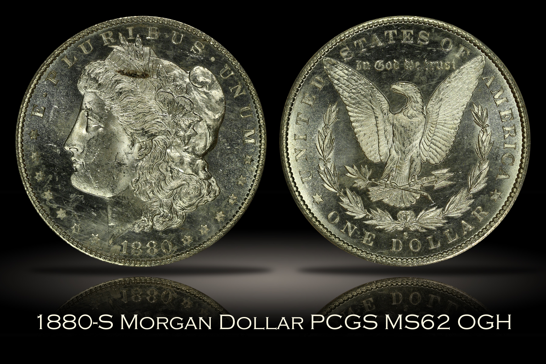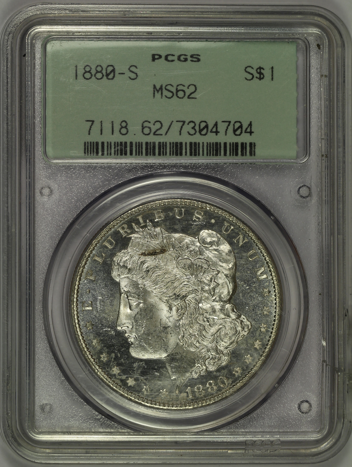 This 1880-S Morgan Silver Dollar has been graded MS62 by PCGS and has been encapsulated in an old green-label holder which is over twenty-five years old. The coin is bright white and lustrous on both sides with fields that are semi-prooflike and quite flashy. There are many light hits and marks on the coin, particularly on the obverse, which seemingly limited the grade. More importantly, this coin is encapsulated in a relatively scarce PCGS holder which is referred to by many as the Generation 2.5 holder (and is cataloged as Generation 2.1 in the PCGS Museum of Coin Holders featured on their website) only produced for a very short time at the end of 1989. This version 2.5 holder is an older-style two-piece holder with an inner part that is similar to an old rattler style slab which is surrounded by an outer stacking ring. Note that the label of the Generation 2.5 holder has a perforated edge and “PCGS” centered at the top, unlike the Generation 2.0 holder which does not have “PCGS” at the top of the label. The holder itself is in good condition without no breaks and just a few minor inclusions and a couple of small cracks in parts of the edge of the outer stacking ring. A nice and flashy Morgan Silver Dollar in the somewhat rare and short-lived PCGS holder. |