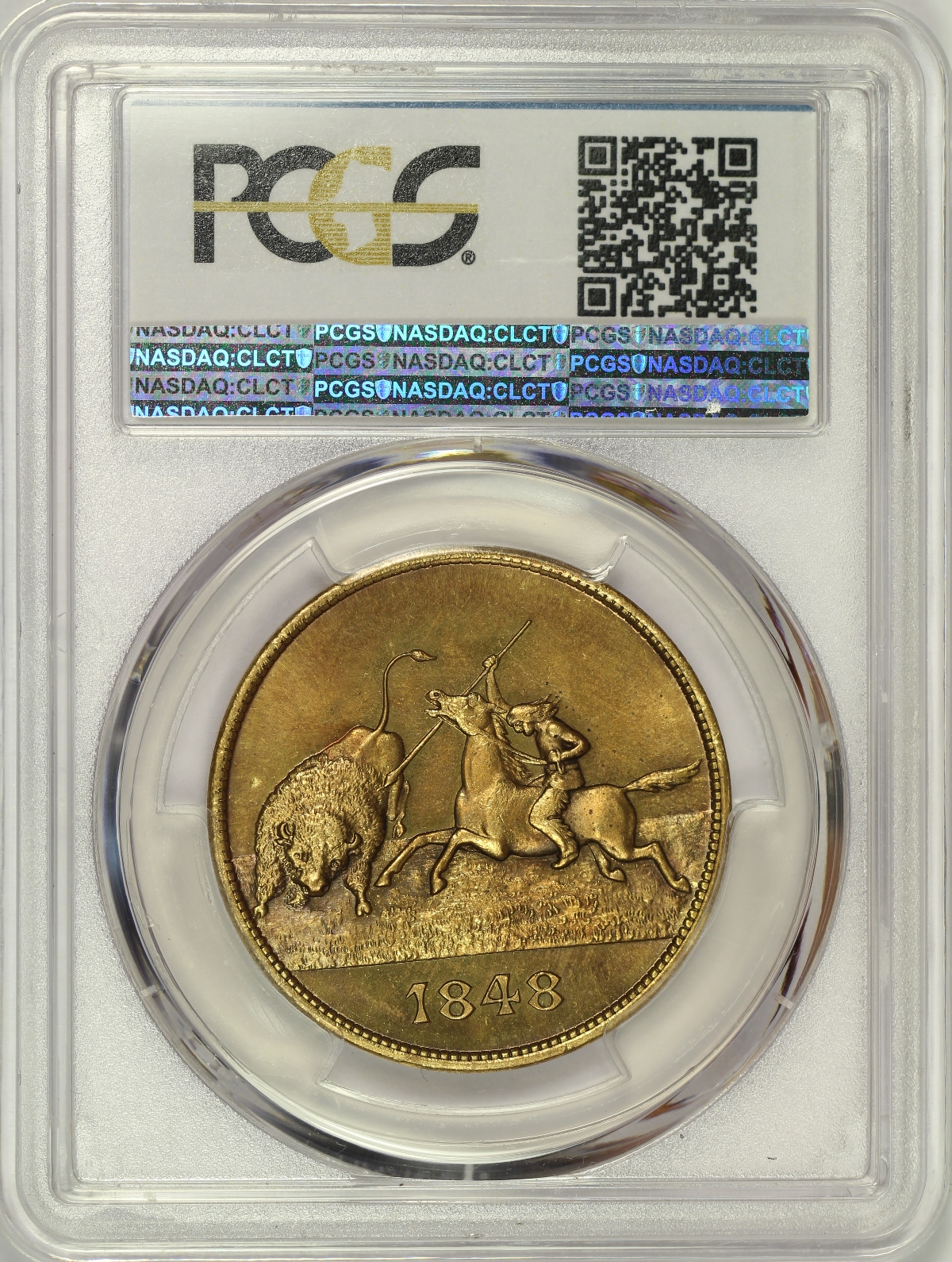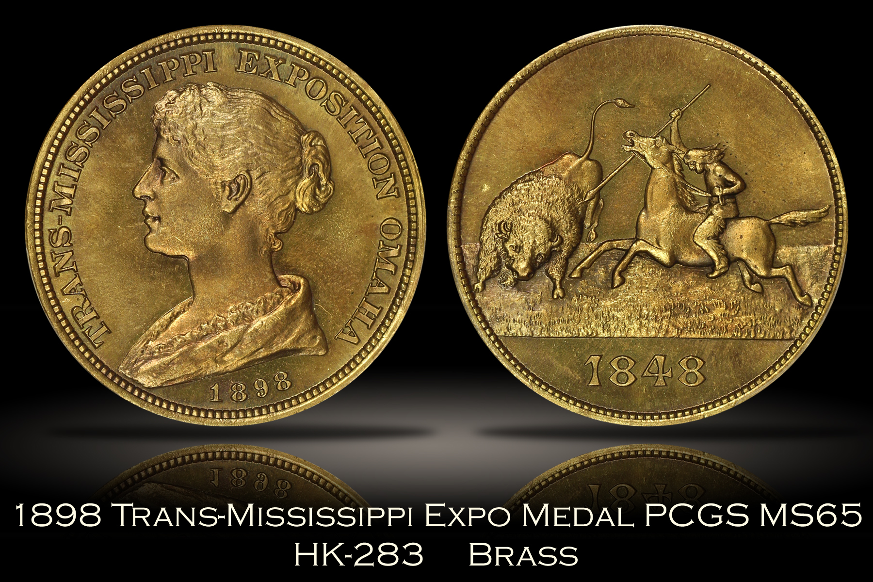 | The Trans-Mississippi and International Exposition was a World’s Fair held in Omaha, Nebraska in 1898. Official medals for the Exposition were struck by the United States Mint at the Exposition in various metal compositions. This example of the 1898 Trans-Mississippi Exposition Official Medal was struck in brass and is listed as HK-283 in the Hibler-Kappen reference on So-Called Dollars. This 1898 HK-283 medal has been graded MS65 by PCGS and is encapsulated in one of the newer-style edge-view holders. The medal has nice cartwheel luster and is a wonderful medium golden color. The fields are also semi-prooflike and have a nice flash to them. The medal is very well struck and the detail of the piece is impressive. There are no major issue of note on this eye appealing so-called dollar.