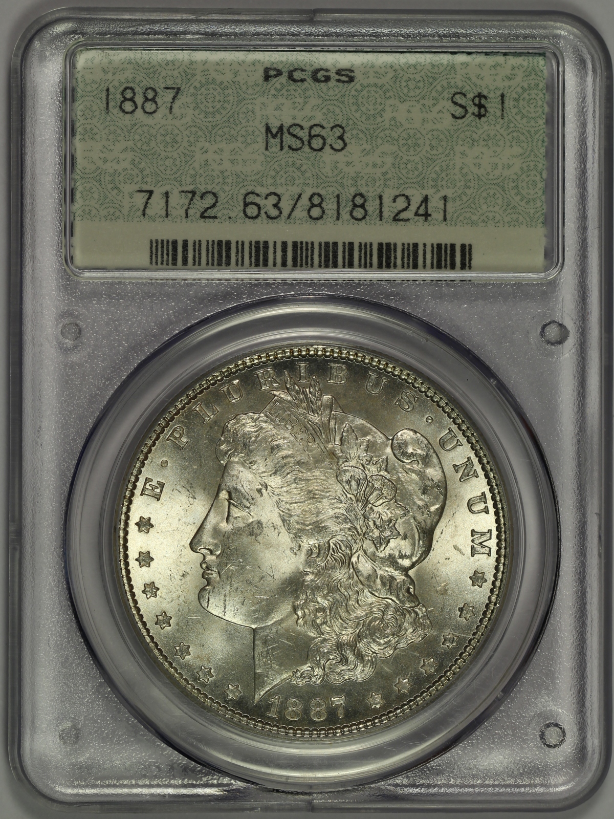 | Here is an 1887 Morgan Silver Dollar which has been graded MS63 by PCGS and is housed in one of the very rare Doily label PCGS holders. This version of the PCGS holder was only used for a couple of weeks during late-1989 before it was quickly phased out. Accordingly, it has been reported that only a few hundred coins in this style of holder are known to exist today and they are highly sought after by collectors. The coin is bright white and has good overall cartwheel luster. There are several small hits and marks on both sides of the coin, typical for the MS63 grade, but nothing too major. There is also a slight bit of haziness on parts of both sides of the coin which becomes evident when the coin is tilted away from the light. Please note that the outer stacking ring of this Doily holder is missing. A decent overall MS63 Morgan Silver Dollar in a PCGS Doily holder! |