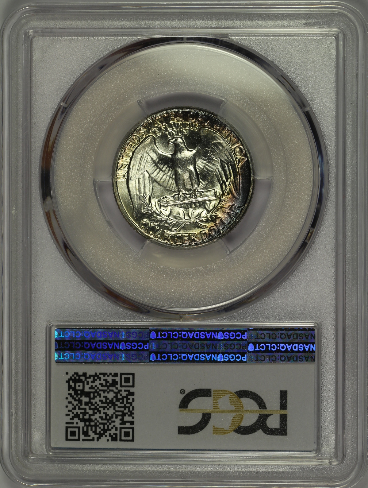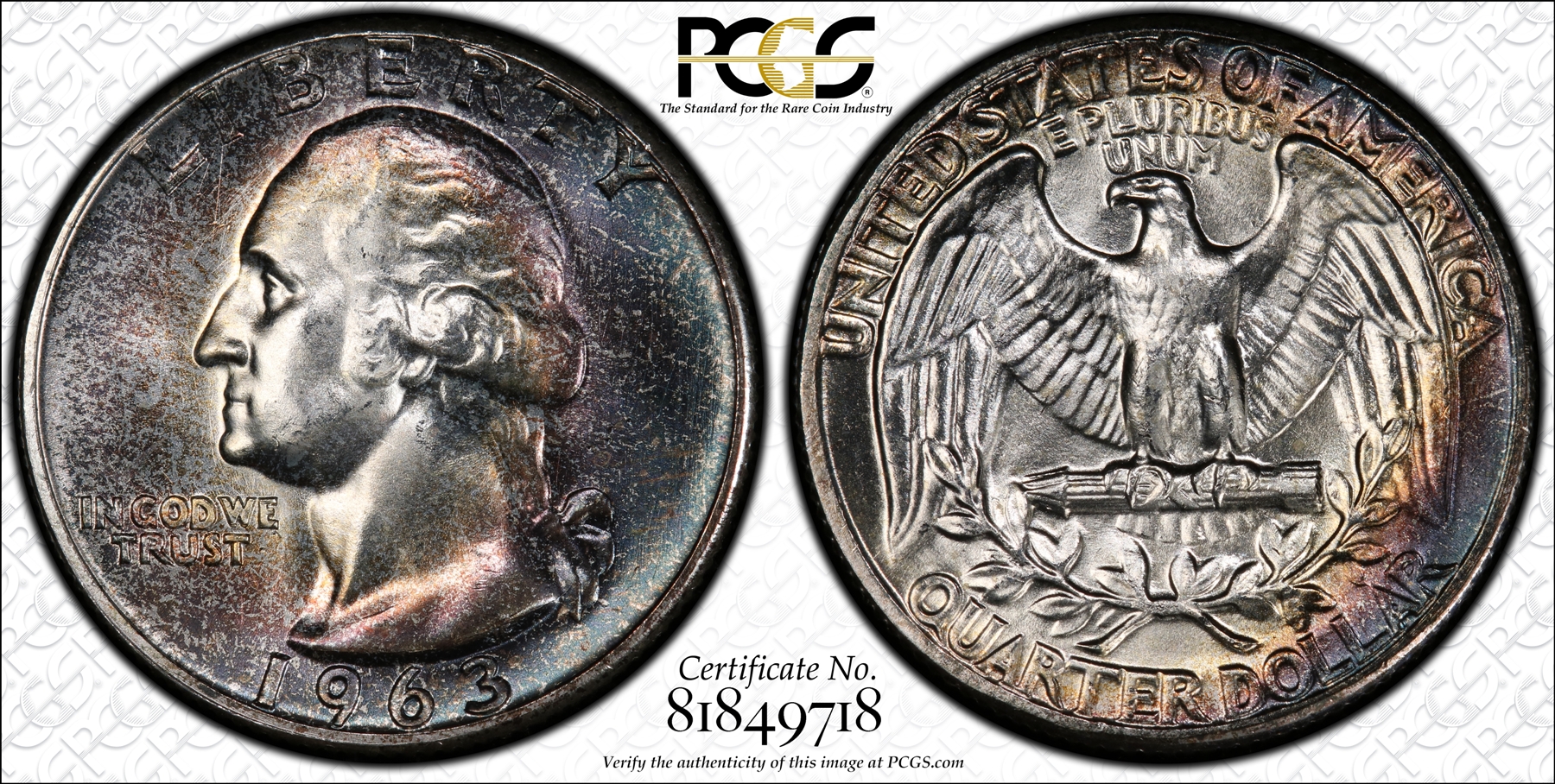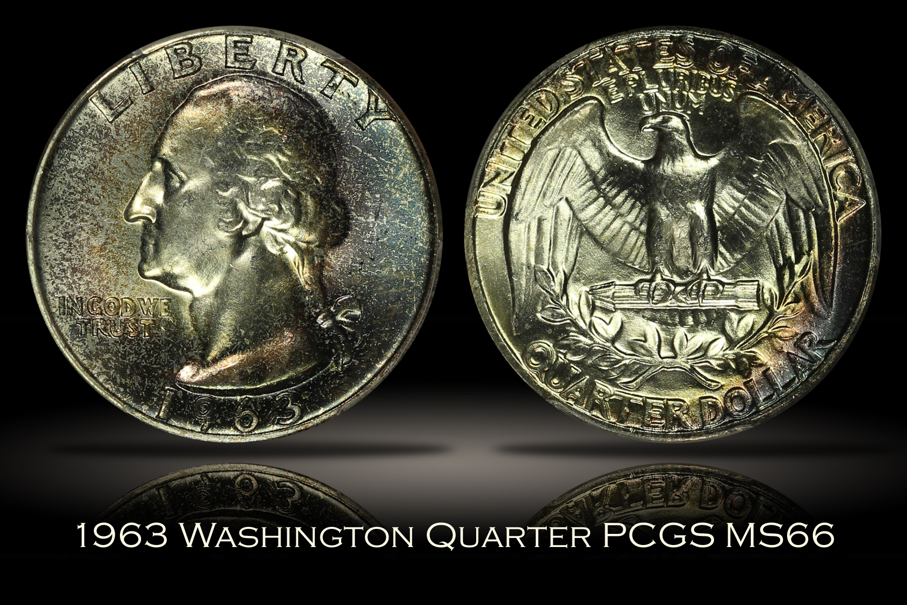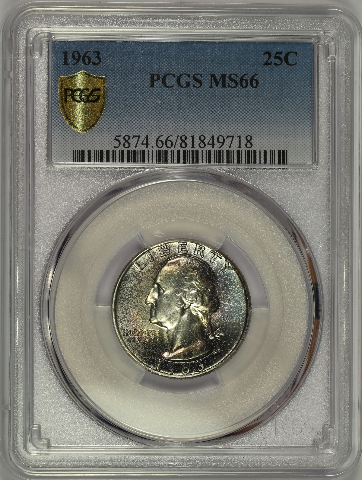 | This 1963 Washington Quarter has been graded MS66 by PCGS and is encapsulated in a newer-style edge-view holder. A TrueView photo was taken by PCGS which captures the beauty of this coin in the best light. The coin has strong mint luster and is moderately toned on both sides. The toning is mostly blue and purple, but some golden and orange color can be seen with a close look. An excellent high grade example that is free of any significant hits, marks or other distractions. |