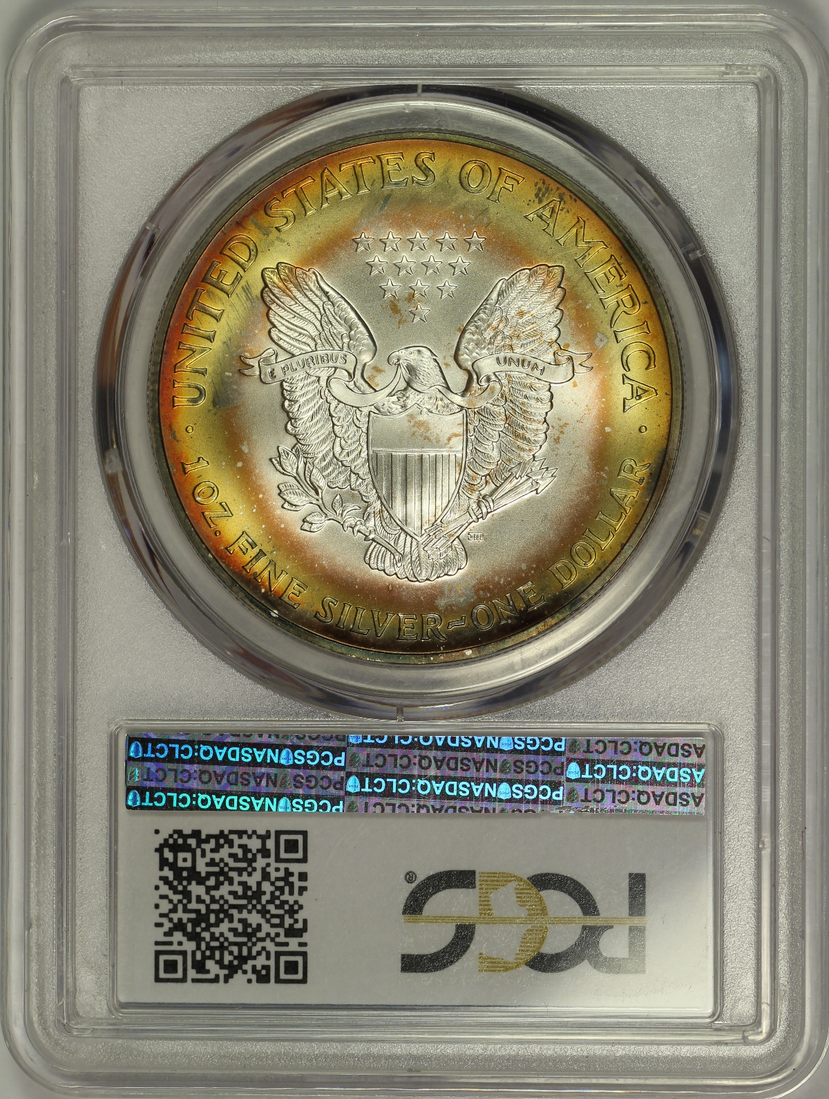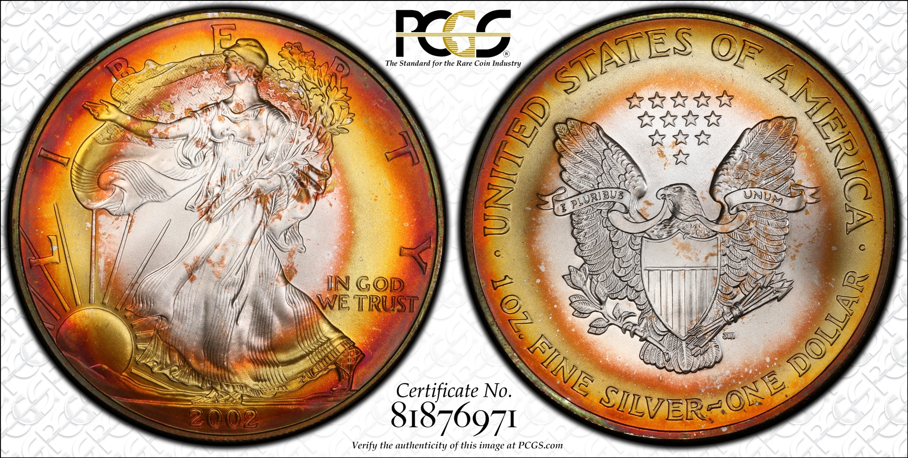 | Here is an attractively toned one ounce .999 fine 2002 Silver Eagle that has been graded MS67 by PCGS. A TrueView photo was taken by PCGS which captures the beauty of this coin in the best light. The example here has a wonderful target-like toning patterns each side that go from a deep purple color at the rim to mostly red, orange and golden colors toward the bright untoned center of each side. A beautiful Silver Eagle with impressive target toning. |