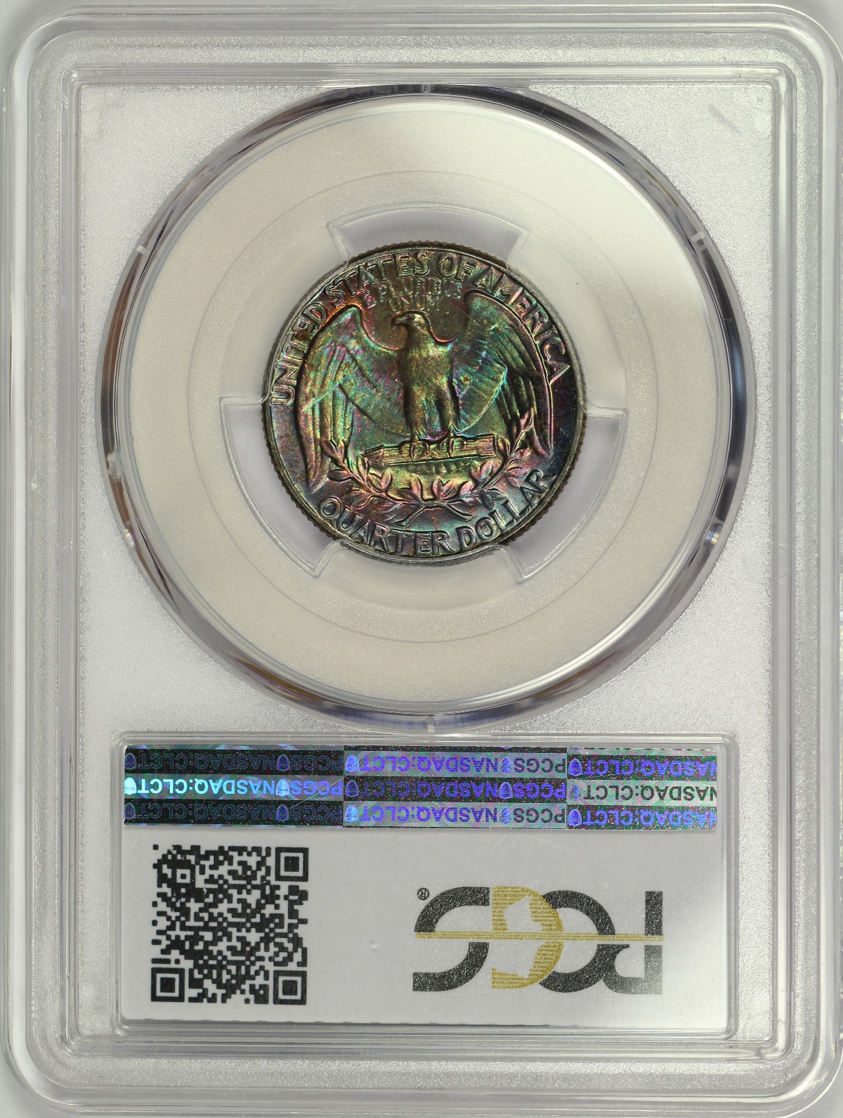 | Over half a billion Washington Quarters were minted at the Philadelphia Mint in 1964. Of that mintage, I would not expect too many to have better overall eye appeal than the present example. This 1964 Washington Quarter that has been graded MS66 by PCGS and is encapsulated in one of the newer-style edge-view holders. A TrueView photo was taken by PCGS which captures the beauty of this coin in the best light. The coin has beautiful toning and strong luster on both sides. The reverse in particular is fully toned with spectacular rainbow color that is even more impressive in hand than the photos show. There are no major hits, marks or other issues of note. One of the most overall eye appealing high-grade Washington Quarters I have handled.