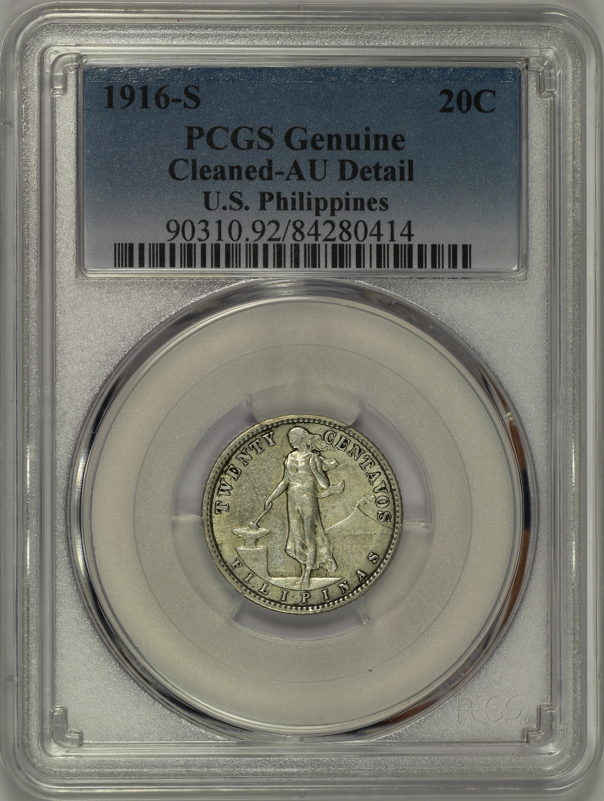 Here is a 1916-S US-Philippines 20 Centavos which has been certified as Genuine with AU Details by PCGS and is encapsulated in the newer-style edge-view holder. I believe this coin is an example of the Straight 6 variety which is cataloged as Allen 11.12 although that is not indicated on the label. Minor hairlines are present in the fields of the coin, though the evidence of a past cleaning is not too distracting in hand. |