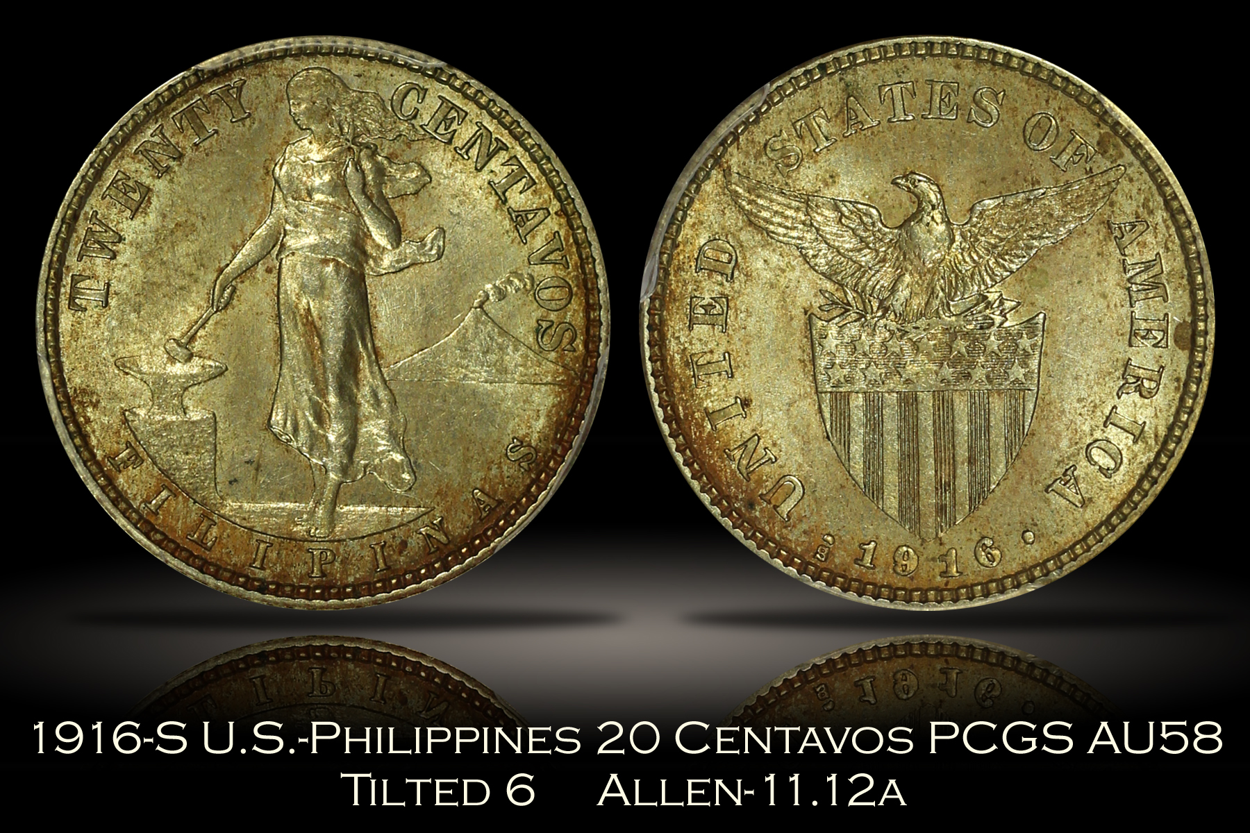 | 1916-S U.S.-Philippines 20 Centavos Tilted 6 Allen 11.12a PCGS AU58 |