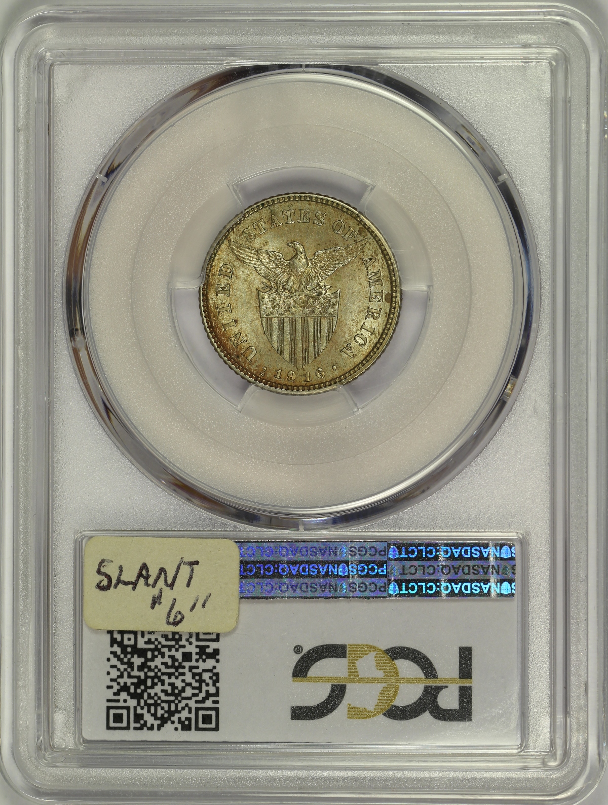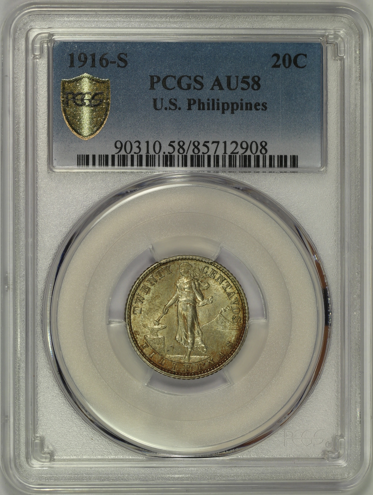 | Here is a 1916-S US-Philippines 20 Centavos which has been graded AU58 by PCGS and is encapsulated in the newer-style edge-view holder. I believe this coin is an example of the Tilted 6 variety which is cataloged as Allen 11.12a although that is not indicated on the label. The piece has light to moderate toning that is primarily golden in color. Has just the slightest evidence of rub on the highest points of the design. |
