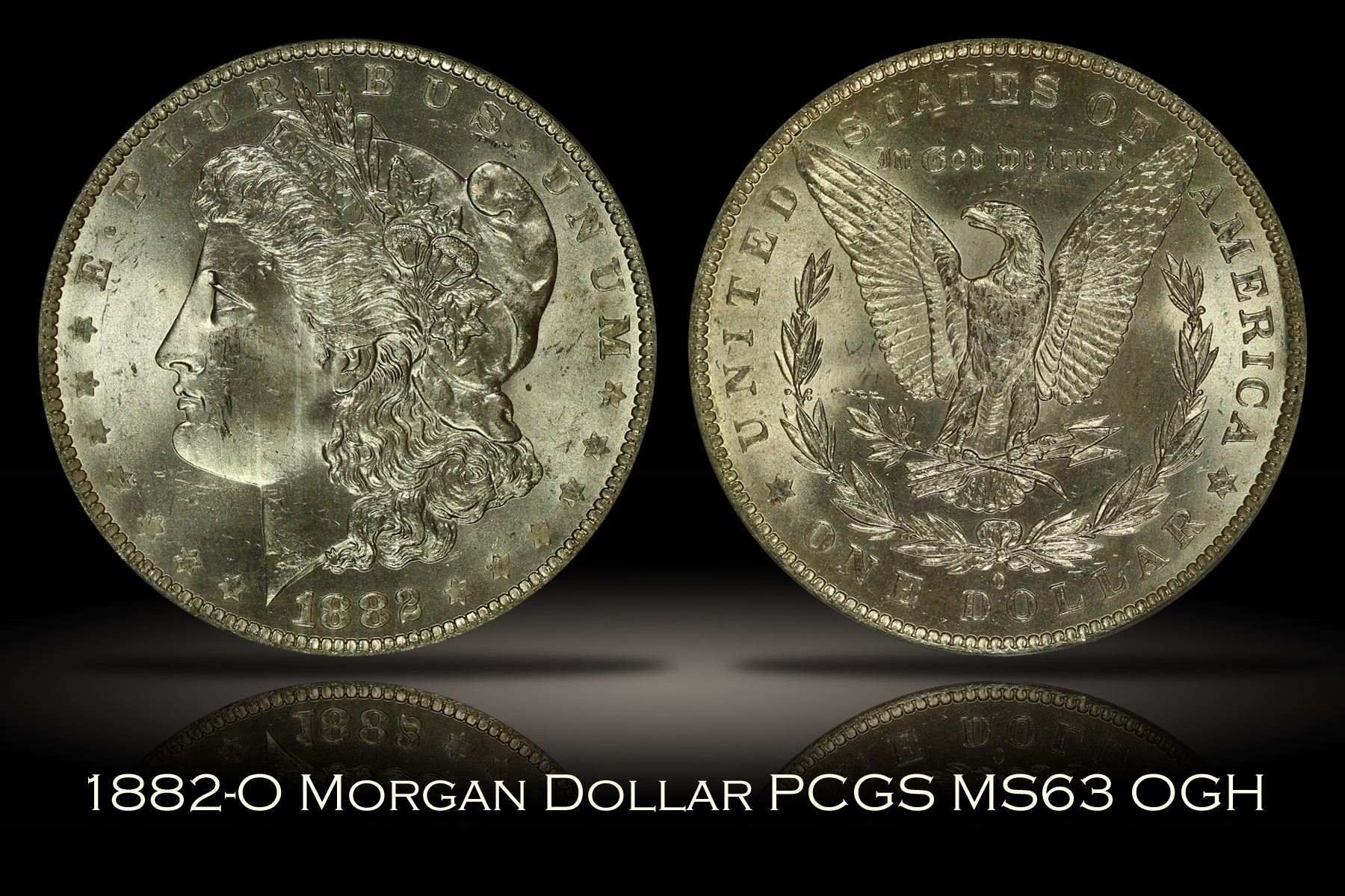 | This 1882-O Morgan Silver Dollar has been graded MS63 by PCGS and has been encapsulated in an old green-label holder which is over twenty-five years old. The coin is bright white and lustrous on both sides and is a flashy coin. Several light marks and hits are found on the obverse in particular as you would expect on an MS63 graded dollar. More importantly, this coin is encapsulated in a relatively scarce PCGS holder which is referred to by many as the Generation 3.5 holder (and is cataloged as Generation 2.2 in the PCGS Museum of Coin Holders featured on their website) only produced for a very short time at the end of 1989 and perhaps into early 1990. This version 3.5 holder is an older-style two-piece holder with an inner part that is similar to an old rattler style slab which is surrounded by an outer stacking ring. Note that the label of the Generation 3.5 holder has a smooth edge with color and font similar to the one-piece old green PCGS holders which followed. The holder itself is in good condition without no breaks and just a few minor inclusions and a minor crack or two in the outer stacking ring. Overall, a wonderful choice uncirculated Morgan Silver Dollar in the somewhat rare and short-lived PCGS holder. |