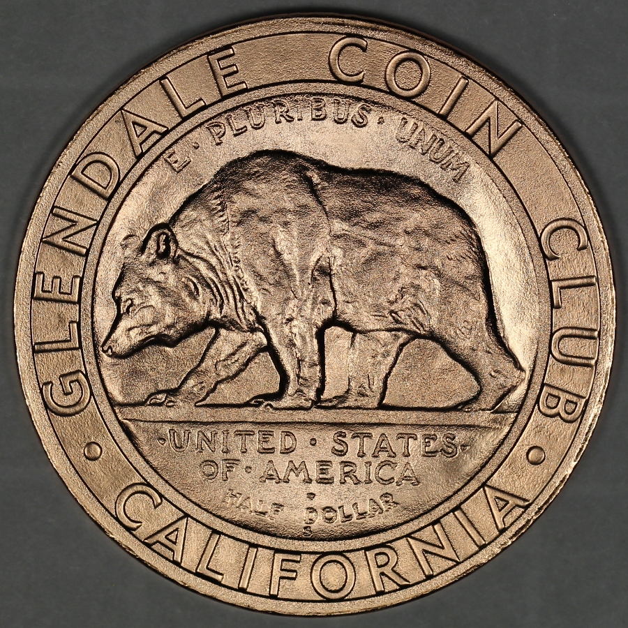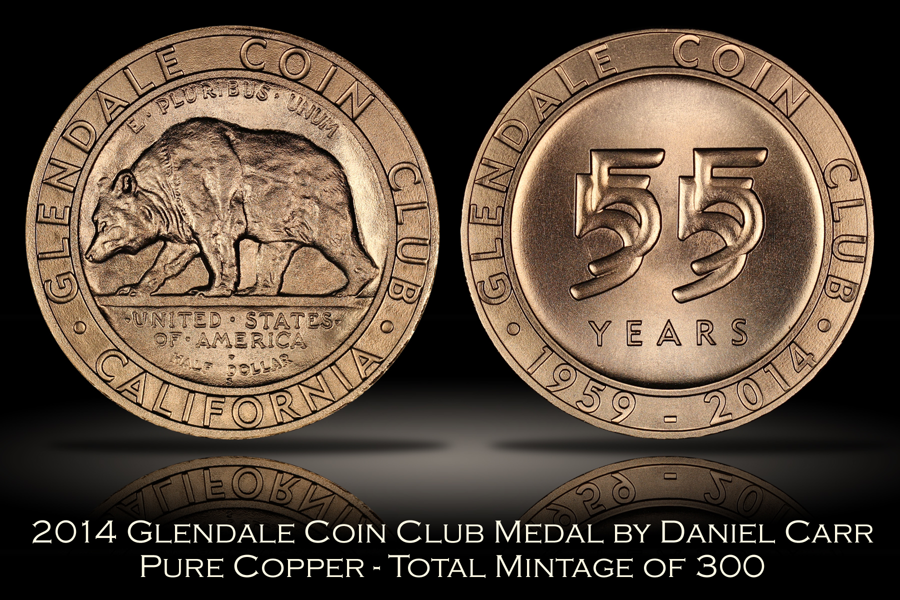 | This 2014 Glendale Coin Club Medal was minted by Daniel Carr in celebration of the 55th anniversary of the Glendale (CA) Coin Club. The obverse design features the grizzly bear design from the 1925 California Diamond Jubilee Commemorative Half Dollar in actual size, with the name of the coin club surrounding. The reverse design features a 55/55 in the style of the 1955 Doubled Die Obverse Lincoln Cent, surrounded by the club name and the dual 1959-2014 date. Examples were struck in copper, silver and gold. Only 300 copper medals were minted, most of which will be retained by club members, making the piece quite rare. The medal is 39mm in diameter and is struck on a pure copper round with a smooth edge. The medal comes in a high quality plastic capsule to protect the near perfect condition of the piece. A beautifully done medal and an opportunity to own a low mintage copper club medal by Daniel Carr which is not available on the Moonlight Mint website. |