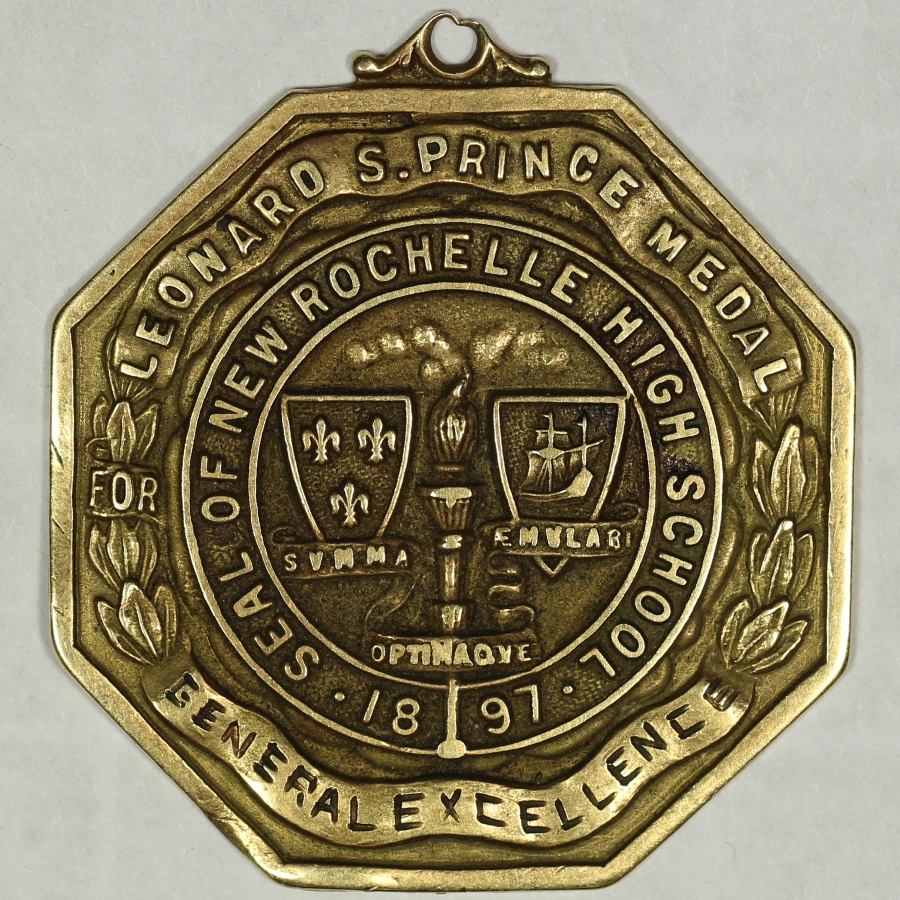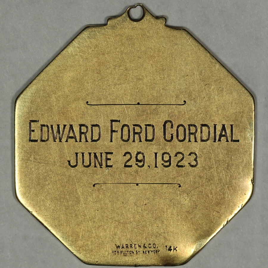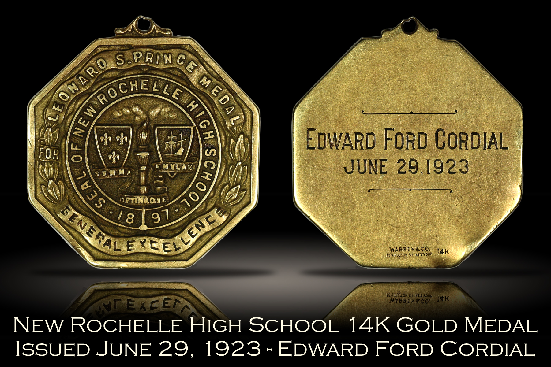 | Here is a really neat octagonal gold medal that is nearly 100 years old. The medal is called the Leonard S. Prince Medal for General Excellence and appears to have been issued by New Rochelle High School to Edward Ford Cordial on June 29, 1923. The medal is stamped on the back as being made by Warren & Co. on Fulton St. in New York and is also stamped as being made of 14K gold. The medal is only lightly worn and has a very cool look. It is a thin piece and has a few minor bends, but they are not too distracting. The medal weighs about 11 grams total. The actual gold weight of the piece is just under 0.2 ounces of pure gold. I was unable to find any information online about this award or the winner, Mr. Cordial. Overall, a very interesting and attractive gold medal. |
