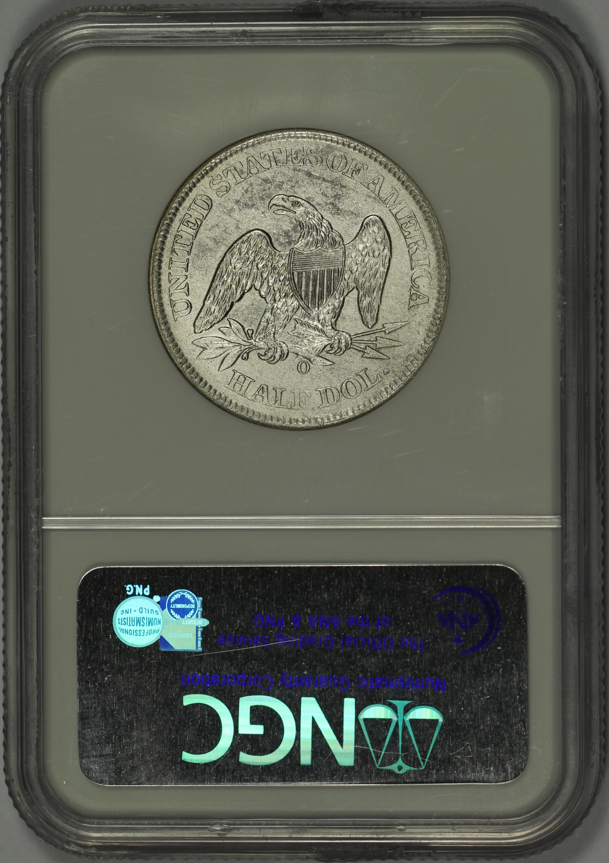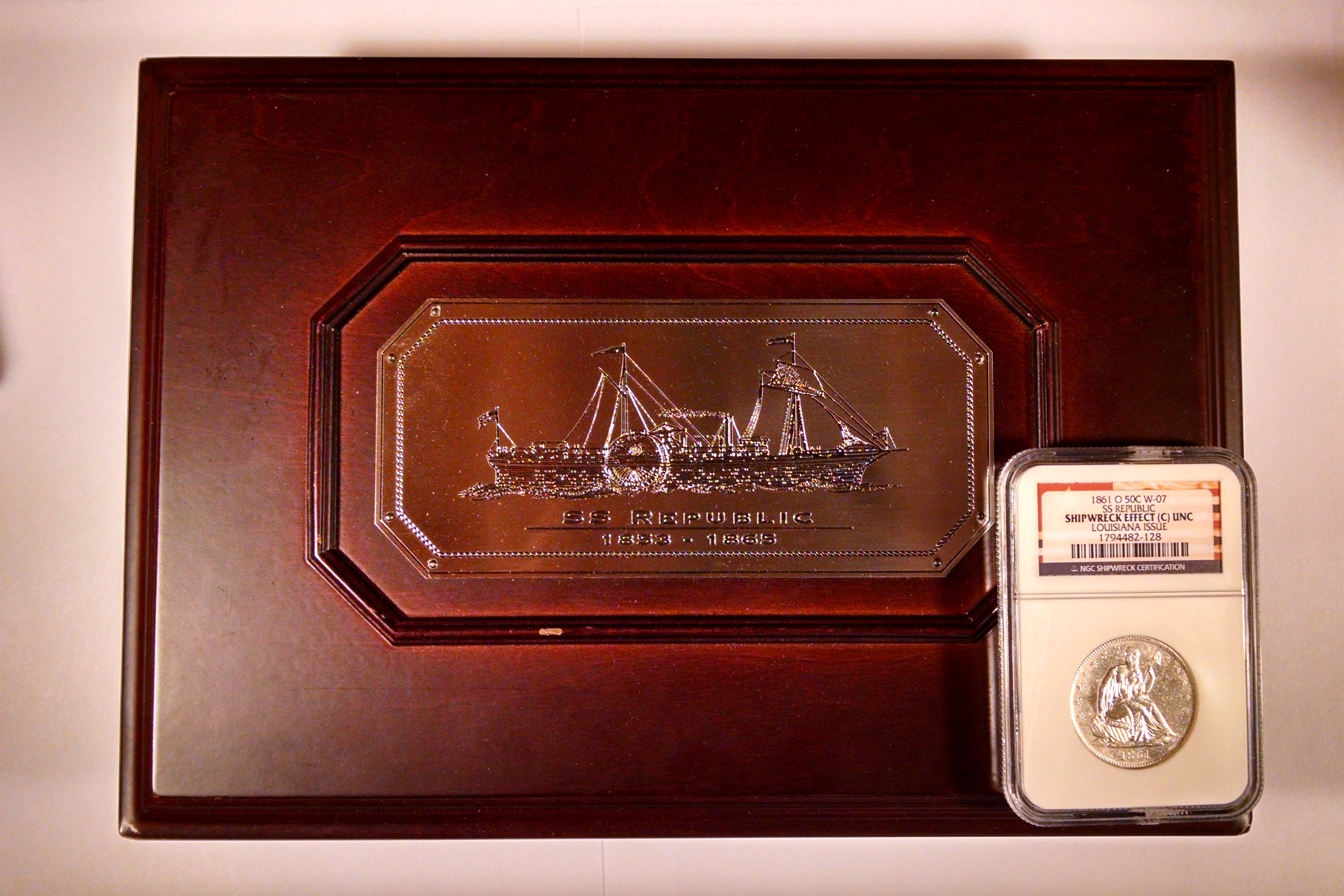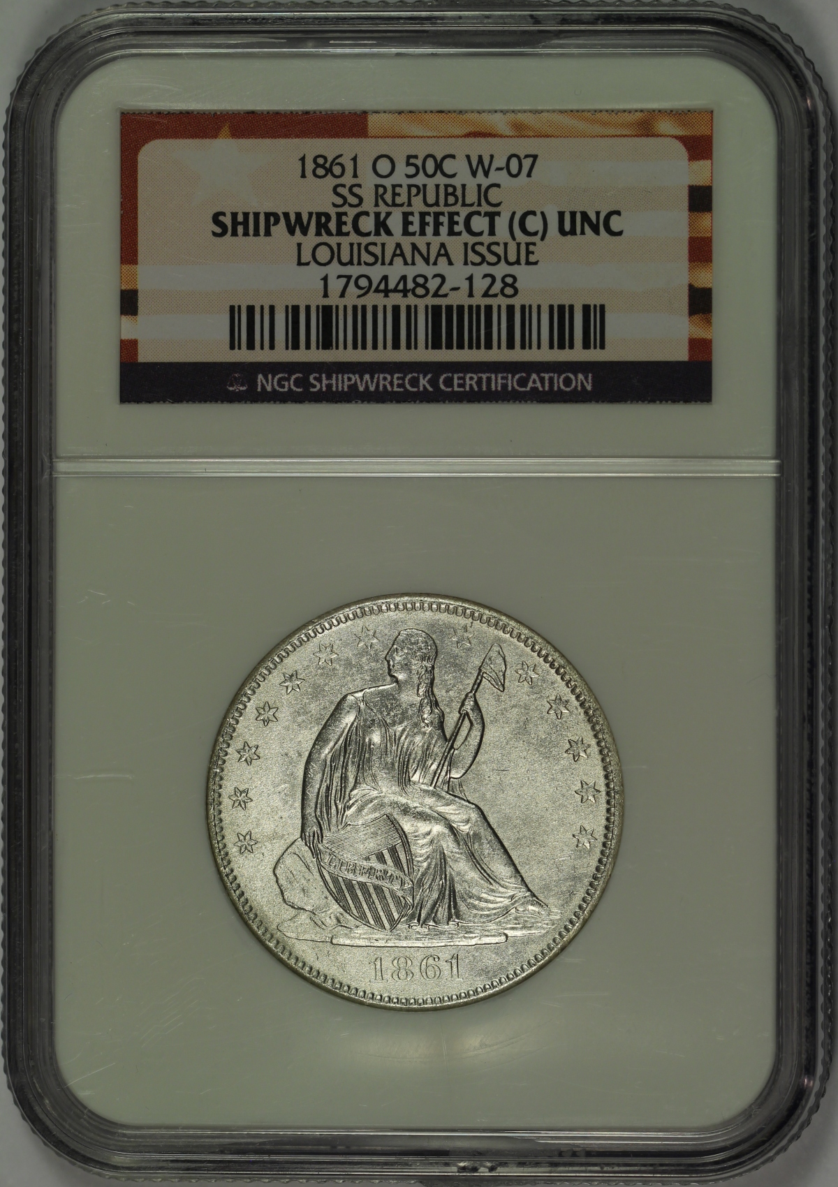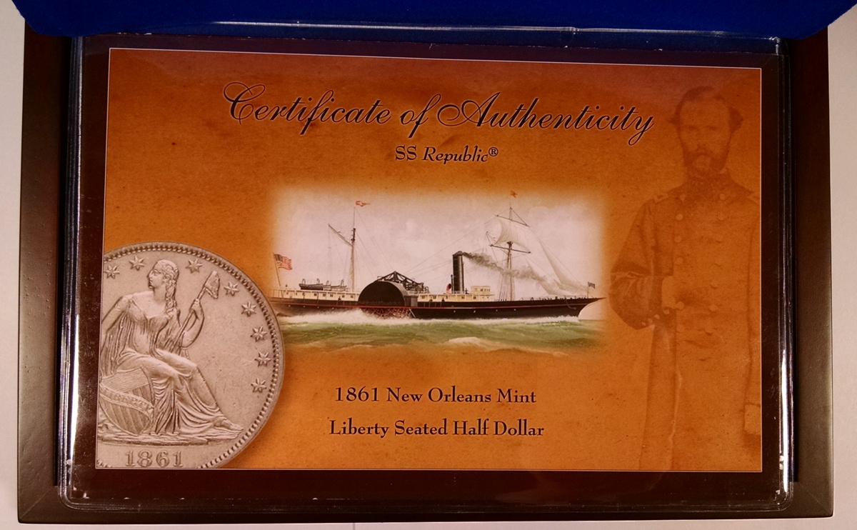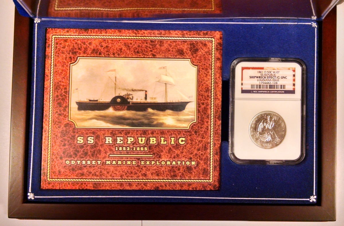 The coin offered here is an 1861-O Seated Liberty Half Dollar which as been certified by NGC as SHIPWRECK EFFECT (C) with UNC details. The coins also certified by NGC as being a Louisiana Issue coin from die pair W-07 meaning that the coin was struck by the New Orleans Mint following Louisiana’s secession from the United States, but before the formation of the Confederate States of America. Although the coin exhibits moderate saltwater damage on the surfaces, the damage is not too severe to preclude the assignment of an uncirculated details grade by NGC. The coin is bright white and untoned with surfaces that show minor corrosion from the many years spent in the ocean. That said, the uncirculated details of the coin remain very strong and the coin is an excellent example of the type. The coin comes with a wooden display box, certificate of authenticity and a DVD movie about the SS Republic and salvage operation by Odyssey Marine. As you can see in the photo, the outside of the wooden box has a couple of minor marks, but remains a nice overall piece. A very neat uncirculated half dollar minted in New Orleans under the authority of the State of Louisiana and ultimately recovered from the SS Republic shipwreck.