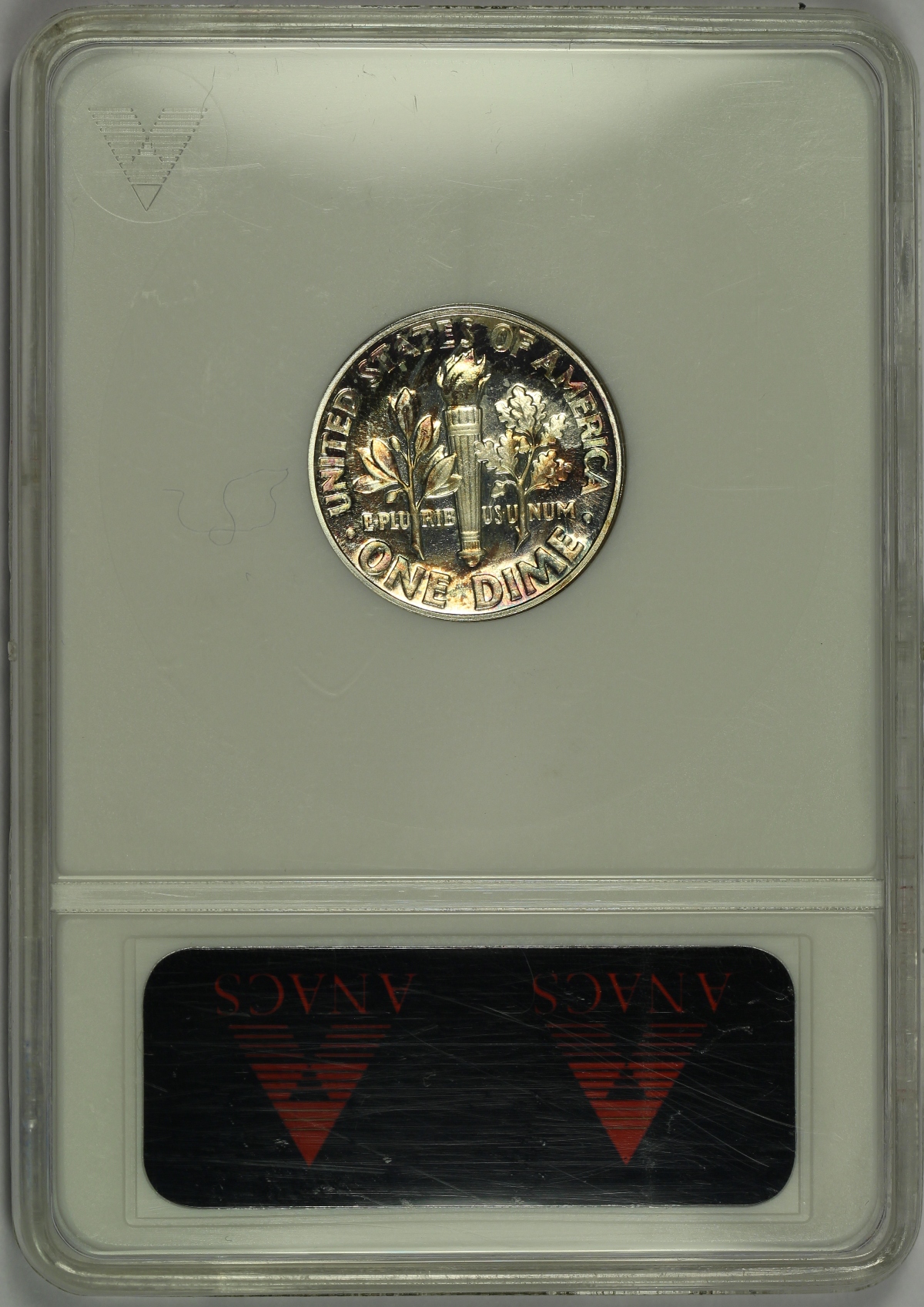 | This 1960 Proof Roosevelt Dime has been graded PF65 by ANACS and is encapsulated in the older small white ANACS holder from many years ago. Of the smaller white ANACS holders, this is a very early variety with a two-letter and four-digit serial number. This dime is one of the doubled die obverse varieties. Please note that there are several doubled die obverse varieties for the 1960 Proof Roosevelt Dime. After close inspection, I believe this coin is the DDO variety which is designated as FS-103 in the Cherrypickers' Guide (although the old ANACS does not specify which particular DDO). The coin is moderately toned on both sides in a colorful, but somewhat inconsistent toning pattern. There are no marks or hits of note on the coin. An interesting example of a doubled die obverse Roosevelt Dime. |