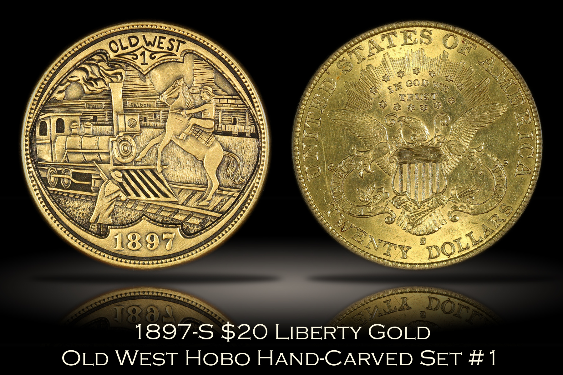 The first coin in the set is the 1897-S $20 Gold Double Eagle. You will see on each of the coins in the set, they are titled “Old West” at the top and individual numbered, this coin being No. 1. The artist, Shane Hunter, did an impressive job carving this piece with an amazing train robbery scene including a detailed train, a life-like horse and even several of the buildings in town.