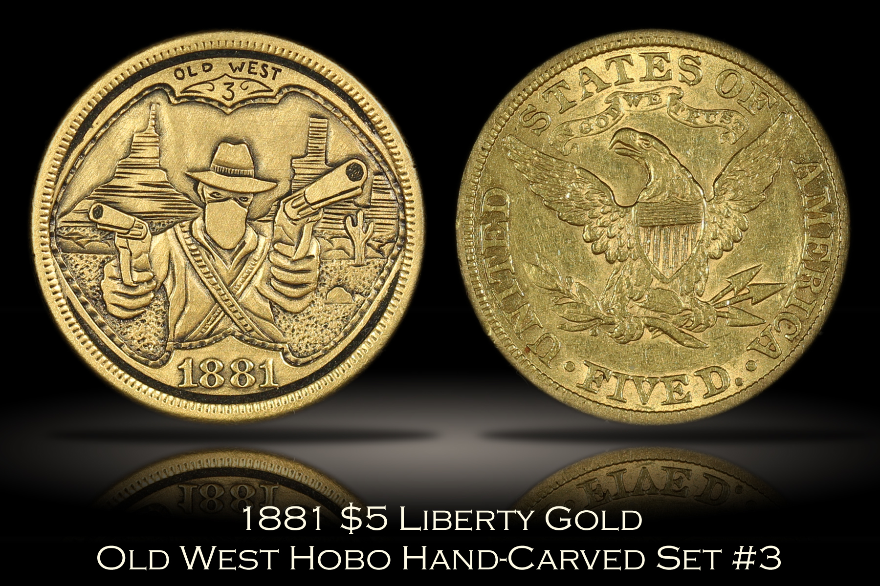 The third coin in the set is the 1881 $5 Gold Half Eagle. The image carved in this coin is one that you would not want to see if you were in the old west. The masked bandit with a pair of guns pointed right at you. Many who saw this image in person likely did not live to tell about it. Of course, this bandit is secure behind plastic and we can all enjoy the fine artistry as well as the impressive desert landscape in the background.