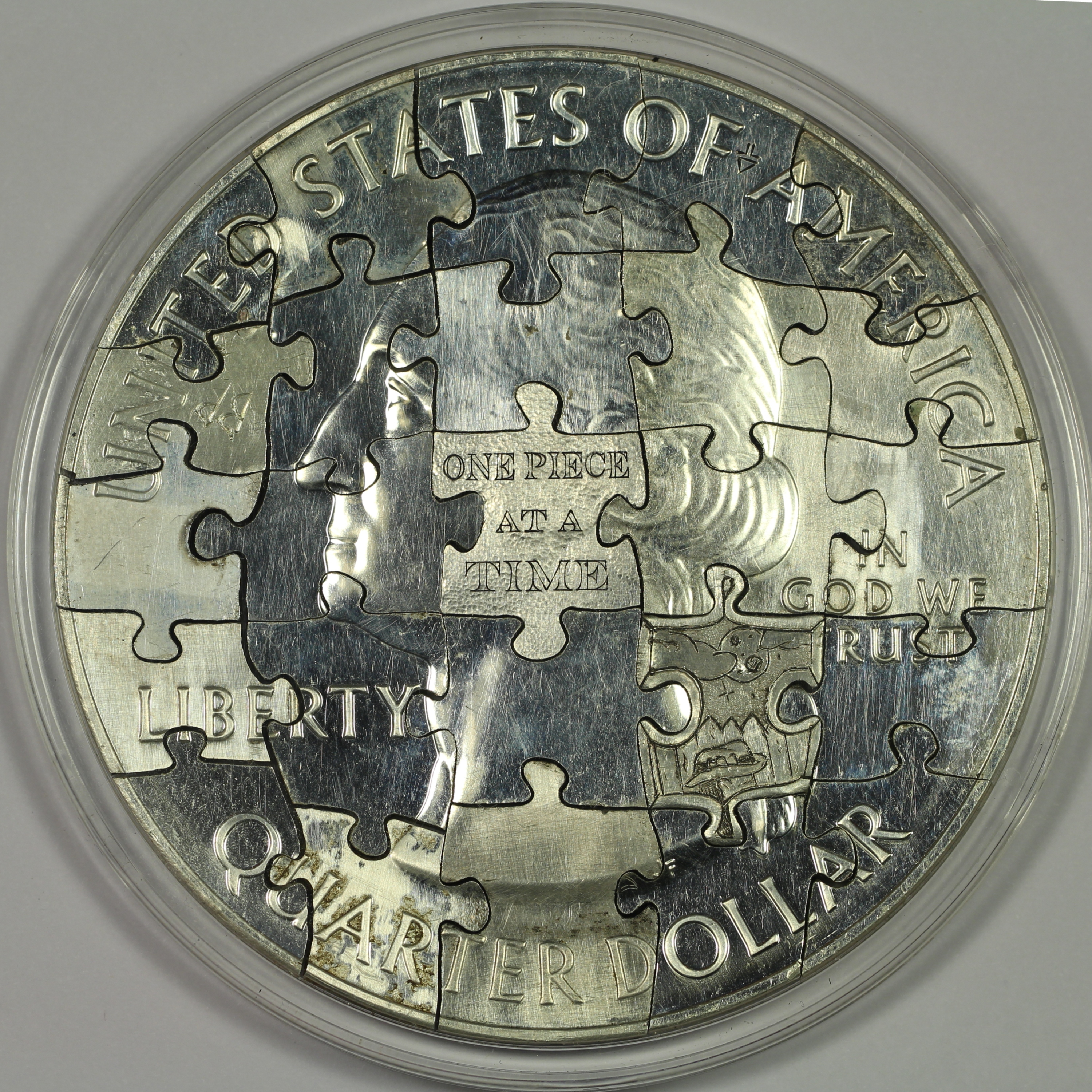 First, Don had a 2011 Gettysburg America the Beautiful 5 oz. Silver Bullion Quarter hand cut into a 25-piece puzzle by Jeremy Barrett of Coin Cut Art.